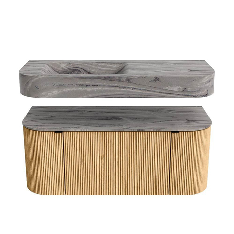 Boven het meubel zweeft een bijpassende, vrij hangende wastafel met afgeronde hoeken – perfect afgestemd op de vorm van de kast. De wastafel is uitgevoerd in Solid Surface en volgt subtiel de lijnen van het onderliggende meubel, waardoor een harmonieus geheel ontstaat. Het Solid Surface topblad vormt een sterke, onderhoudsvriendelijke basis en maakt de combinatie compleet.