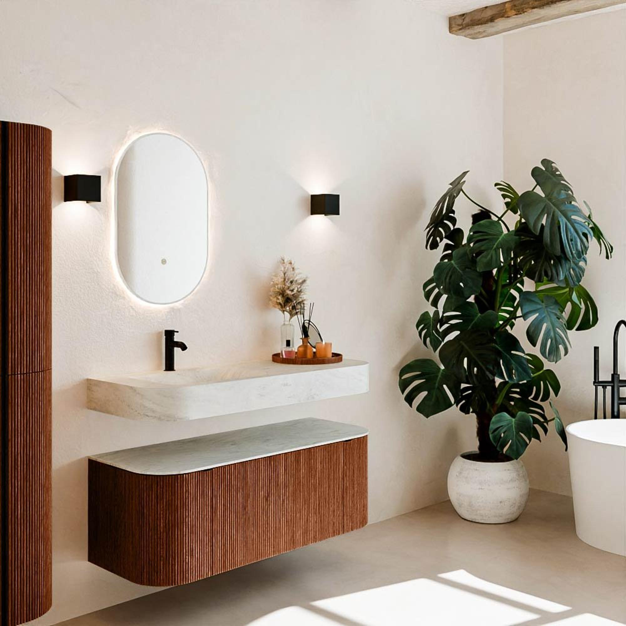 Natuurlijke materialen in warme tinten. De verticale ribbels brengen ritme en textuur in het ontwerp, terwijl het eikenhout zorgt voor een warme, ambachtelijke uitstraling. Kies uit 5 houttinten OAK, WALNUT, DUSK, SHADOW en RUBY zorgvuldig geselecteerde houtkleuren om zowel moderne als klassieke badkamers te verrijken.