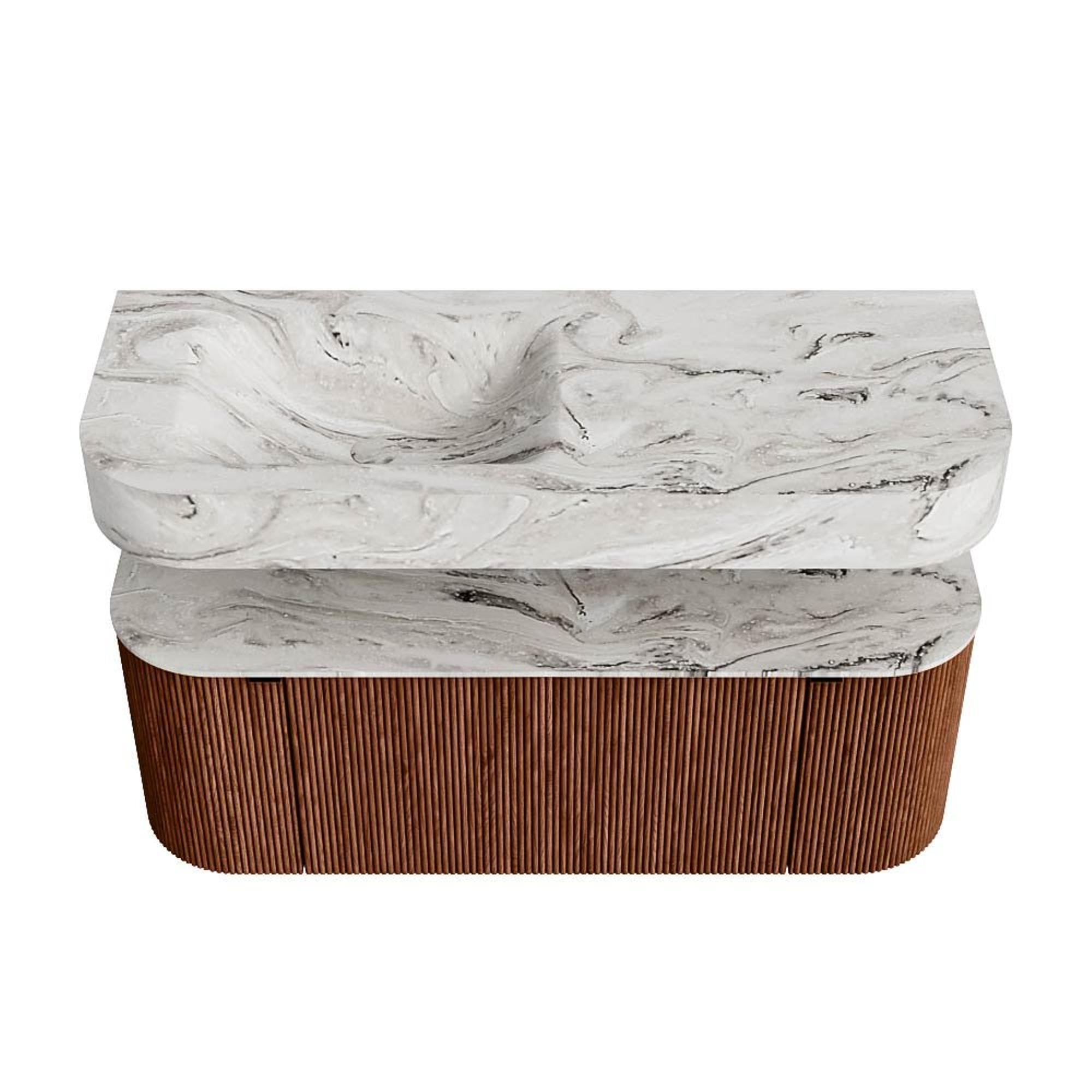 MONDIAZ THOR-DLUX 120cm badmeubel ronding links + rechts kleur Ruby met 1 lade en 2 deuren. Vrijhangende wastafel CLOUD Links 1 kraangat kleur Glace.