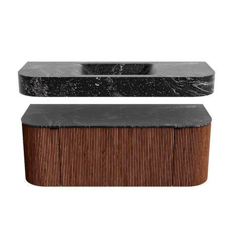 Boven het meubel zweeft een bijpassende, vrij hangende wastafel met afgeronde hoeken – perfect afgestemd op de vorm van de kast. De wastafel is uitgevoerd in Solid Surface en volgt subtiel de lijnen van het onderliggende meubel, waardoor een harmonieus geheel ontstaat. Het Solid Surface topblad vormt een sterke, onderhoudsvriendelijke basis en maakt de combinatie compleet.