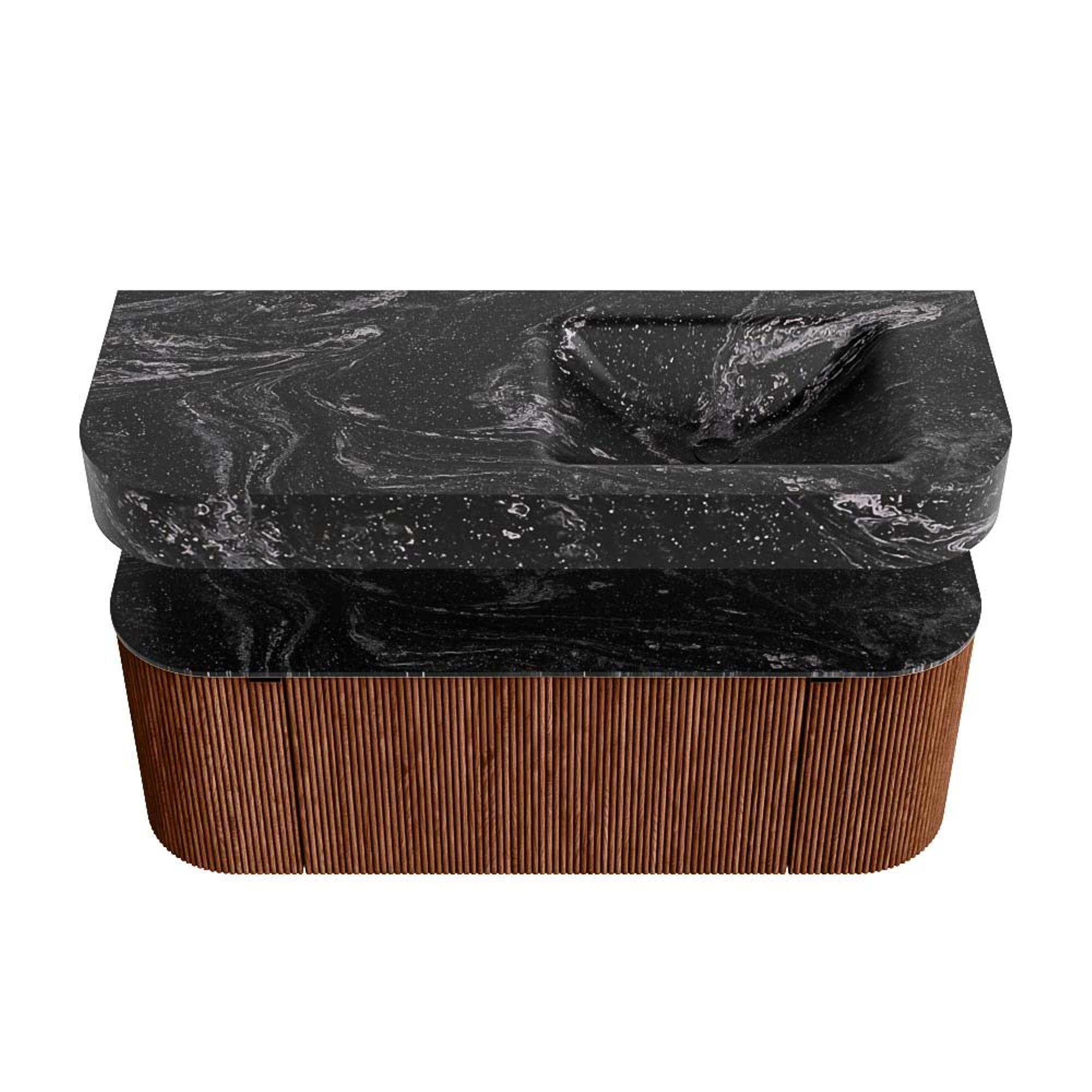 MONDIAZ THOR-DLUX 120cm badmeubel ronding links + rechts kleur Ruby met 1 lade en 2 deuren. Vrijhangende wastafel CLOUD Rechts 1 kraangat kleur Lava.