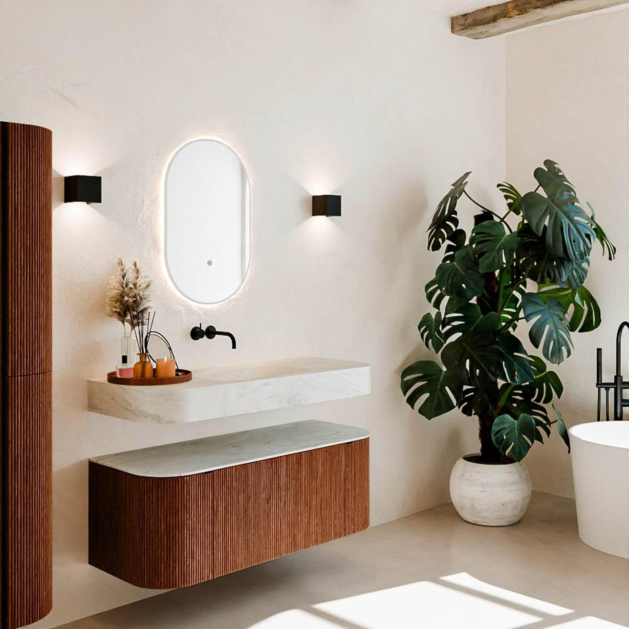 Natuurlijke materialen in warme tinten. De verticale ribbels brengen ritme en textuur in het ontwerp, terwijl het eikenhout zorgt voor een warme, ambachtelijke uitstraling. Kies uit 5 houttinten OAK, WALNUT, DUSK, SHADOW en RUBY zorgvuldig geselecteerde houtkleuren om zowel moderne als klassieke badkamers te verrijken.