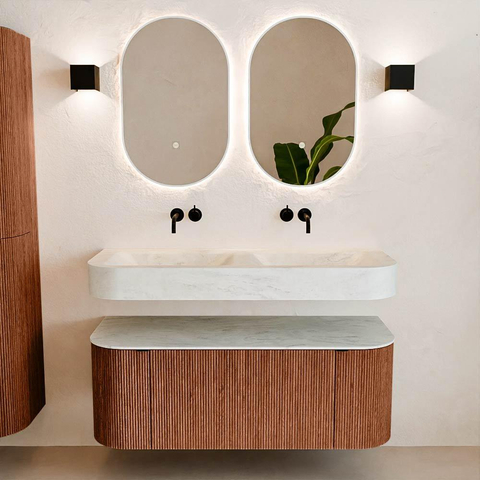 Natuurlijke materialen in warme tinten. De verticale ribbels brengen ritme en textuur in het ontwerp, terwijl het eikenhout zorgt voor een warme, ambachtelijke uitstraling. Kies uit 5 houttinten OAK, WALNUT, DUSK, SHADOW en RUBY zorgvuldig geselecteerde houtkleuren om zowel moderne als klassieke badkamers te verrijken.