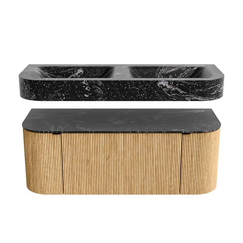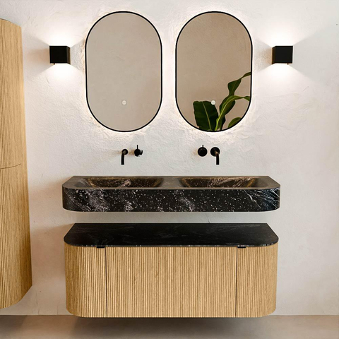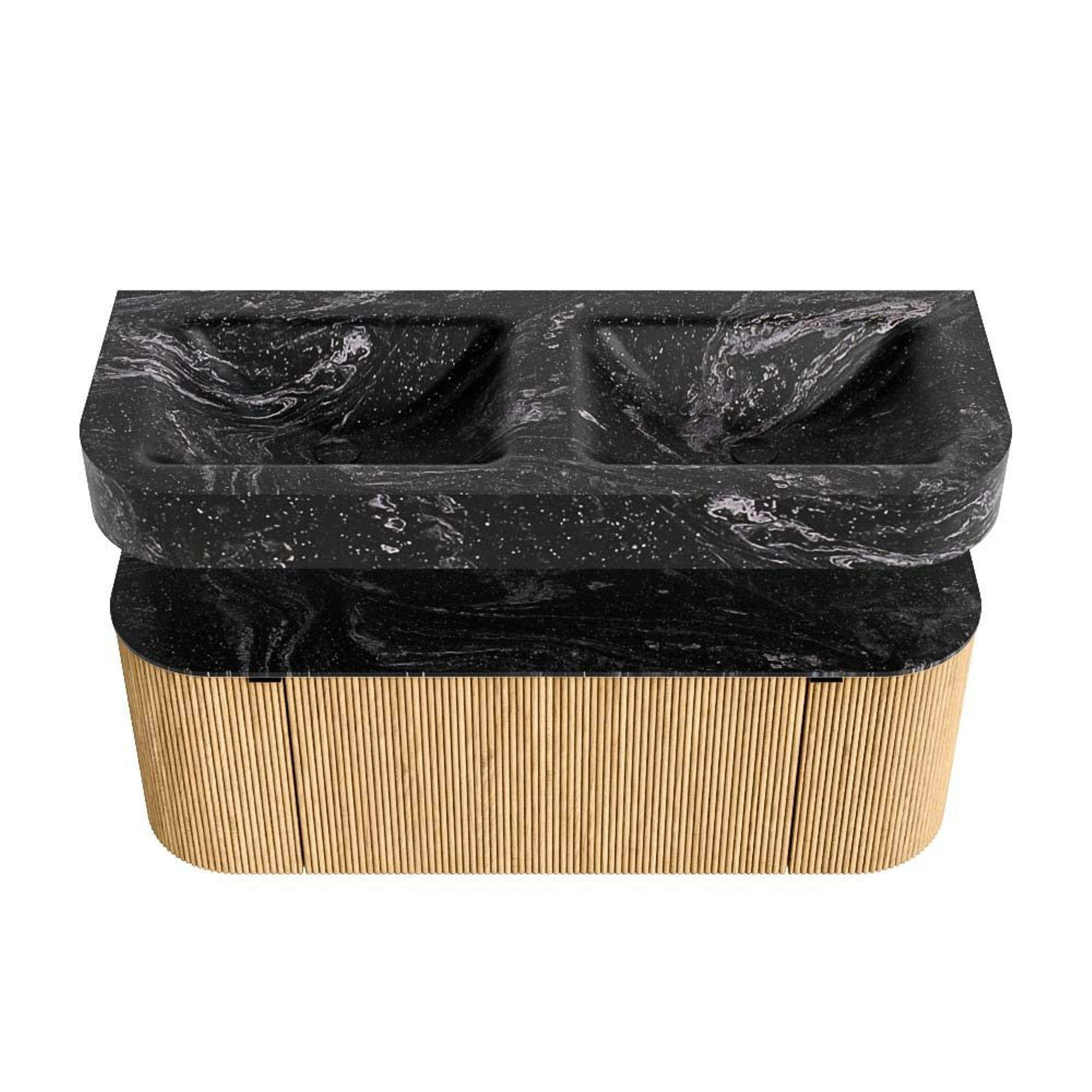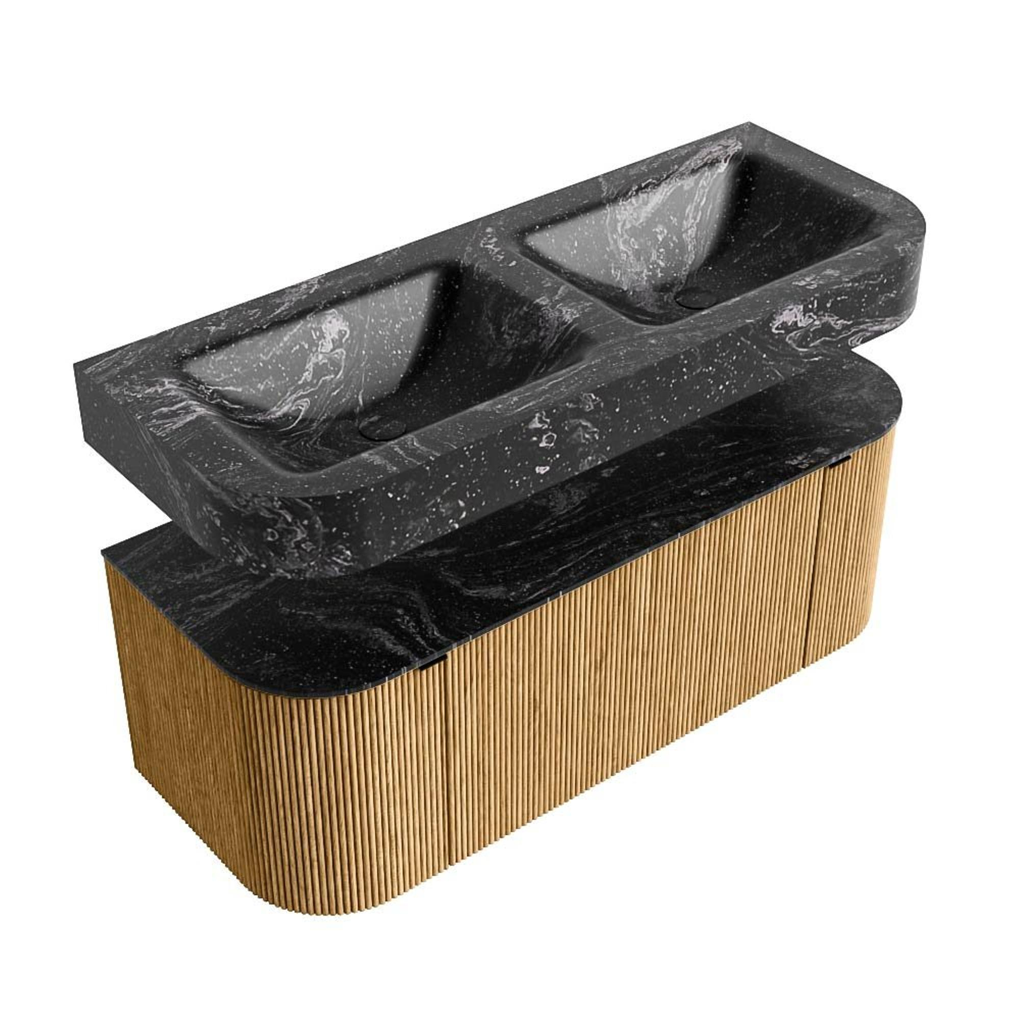 MONDIAZ THOR-DLUX 120cm badmeubel ronding links + rechts kleur Oak met 1 lade en 2 deuren. Vrijhangende wastafel CLOUD Dubbel zonder kraangat kleur Lava.