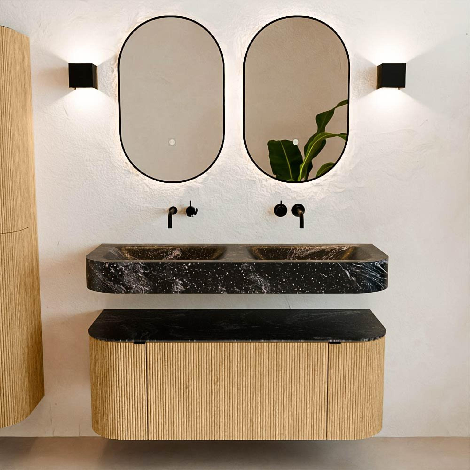 Natuurlijke materialen in warme tinten. De verticale ribbels brengen ritme en textuur in het ontwerp, terwijl het eikenhout zorgt voor een warme, ambachtelijke uitstraling. Kies uit 5 houttinten OAK, WALNUT, DUSK, SHADOW en RUBY zorgvuldig geselecteerde houtkleuren om zowel moderne als klassieke badkamers te verrijken.