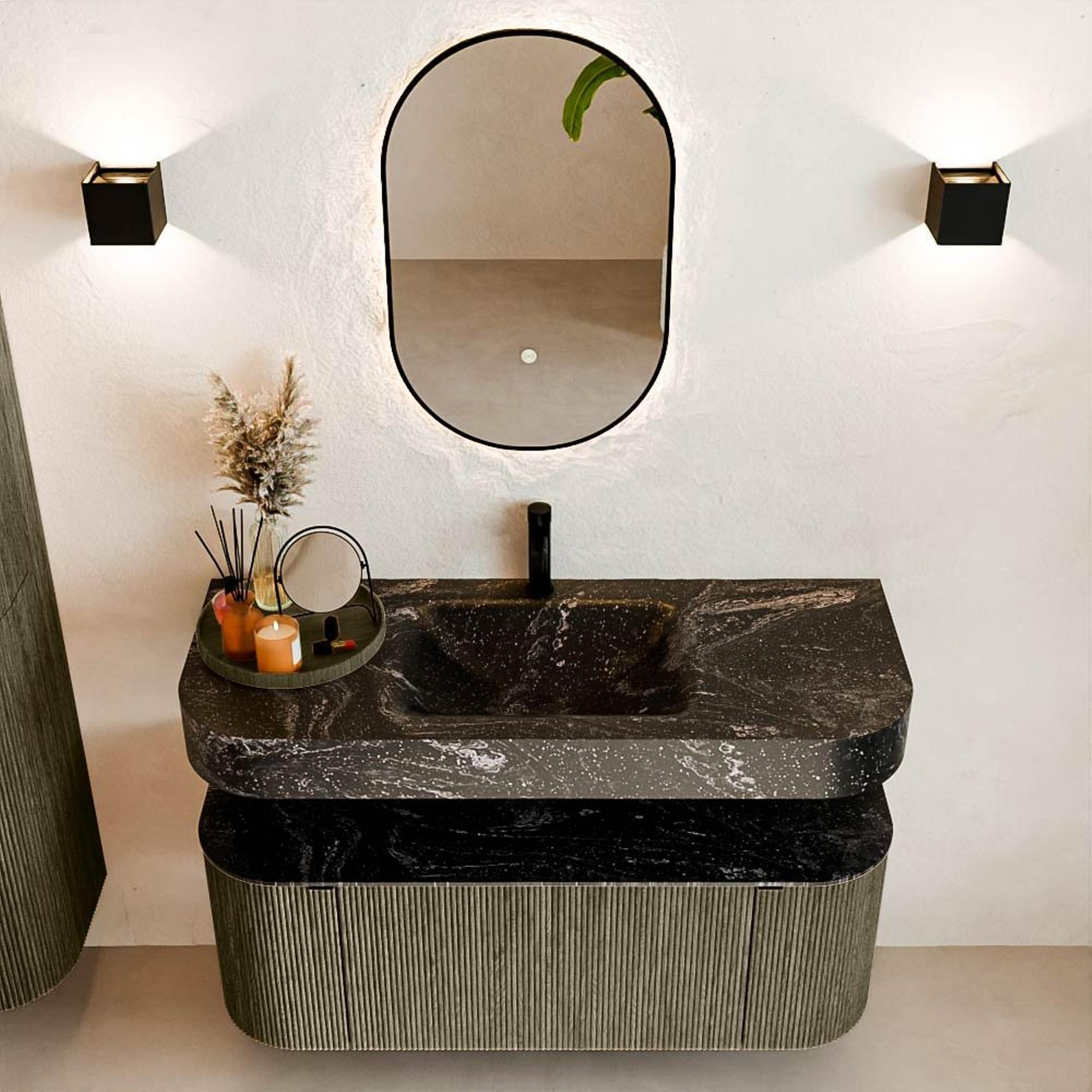 MONDIAZ THOR-DLUX 120cm badmeubel ronding links + rechts kleur Shadow met 1 lade en 2 deuren. Vrijhangende wastafel CLOUD Midden 1 kraangat kleur Lava.