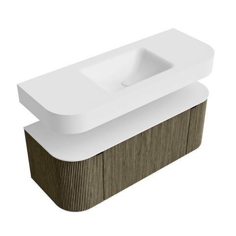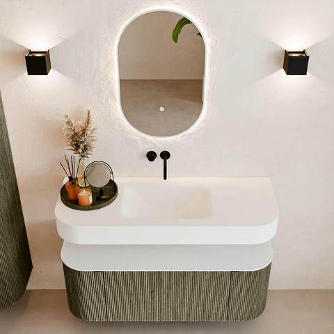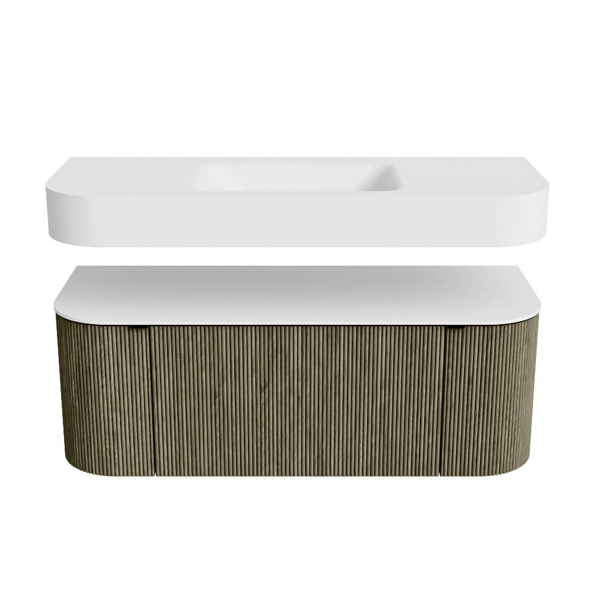 Boven het meubel zweeft een bijpassende, vrij hangende wastafel met afgeronde hoeken – perfect afgestemd op de vorm van de kast. De wastafel is uitgevoerd in Solid Surface en volgt subtiel de lijnen van het onderliggende meubel, waardoor een harmonieus geheel ontstaat. Het Solid Surface topblad vormt een sterke, onderhoudsvriendelijke basis en maakt de combinatie compleet.