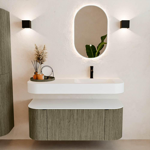 Boven het meubel zweeft een bijpassende, vrij hangende wastafel met afgeronde hoeken – perfect afgestemd op de vorm van de kast. De wastafel is uitgevoerd in Solid Surface en volgt subtiel de lijnen van het onderliggende meubel, waardoor een harmonieus geheel ontstaat. Het Solid Surface topblad vormt een sterke, onderhoudsvriendelijke basis en maakt de combinatie compleet.