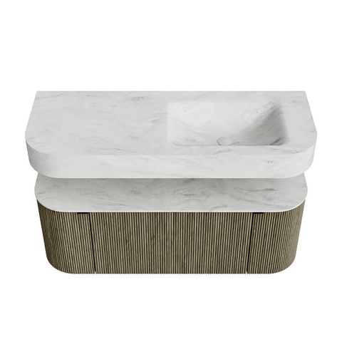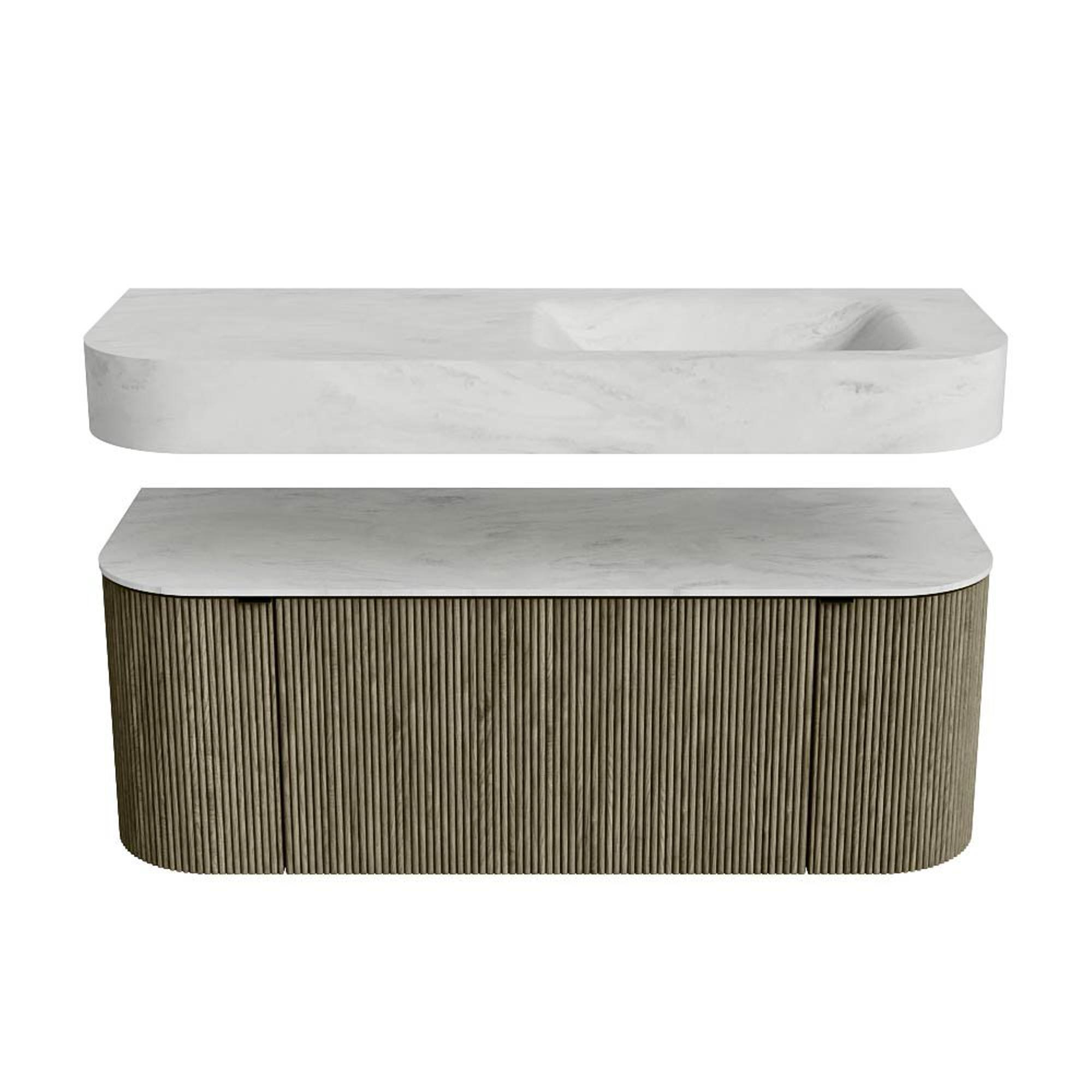 MONDIAZ THOR-DLUX 120cm badmeubel ronding links + rechts kleur Shadow met 1 lade en 2 deuren. Vrijhangende wastafel CLOUD Rechts 1 kraangat kleur Opalo.