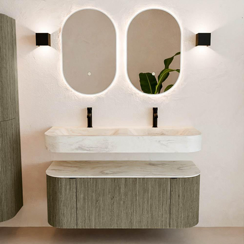 Natuurlijke materialen in warme tinten. De verticale ribbels brengen ritme en textuur in het ontwerp, terwijl het eikenhout zorgt voor een warme, ambachtelijke uitstraling. Kies uit 5 houttinten OAK, WALNUT, DUSK, SHADOW en RUBY zorgvuldig geselecteerde houtkleuren om zowel moderne als klassieke badkamers te verrijken.