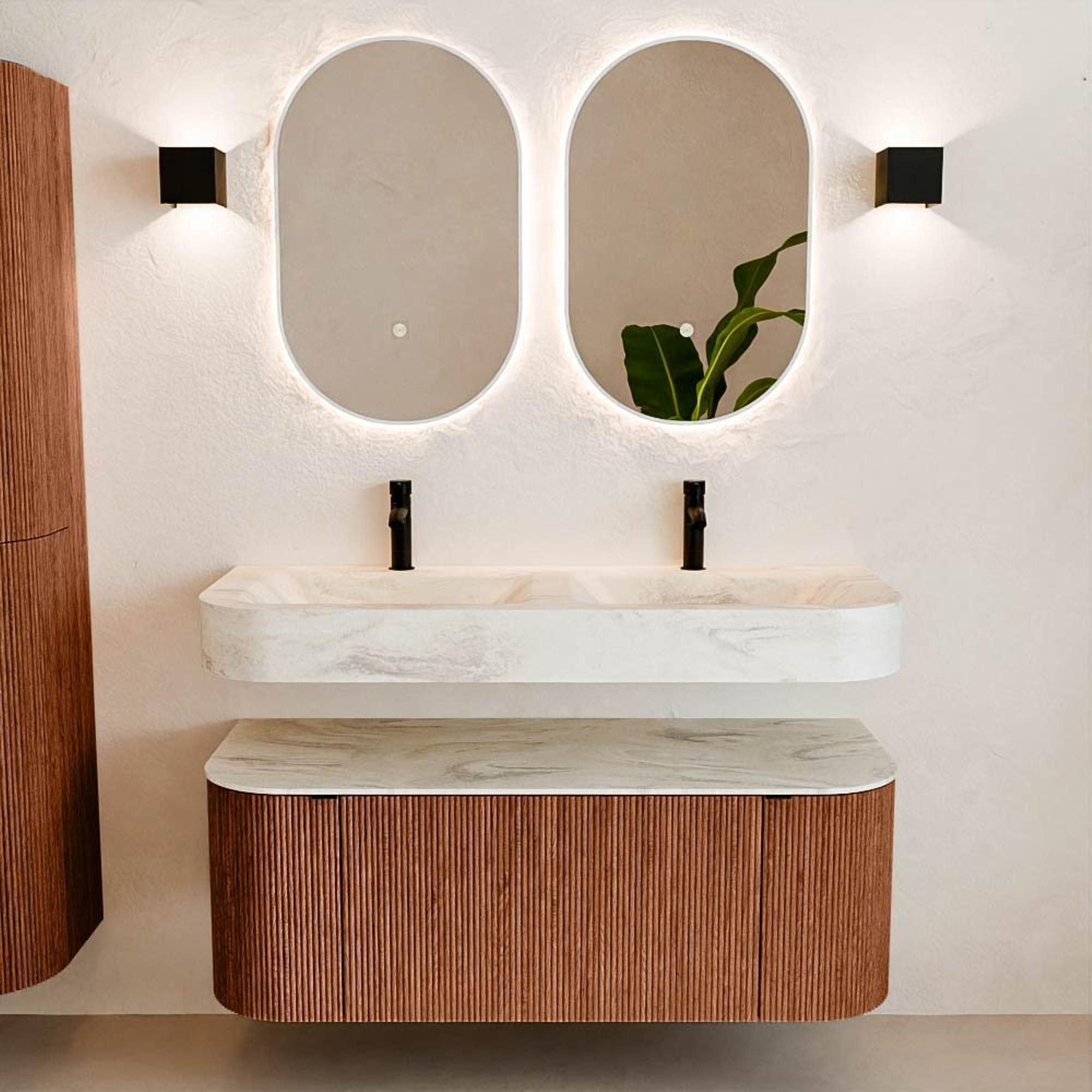 Natuurlijke materialen in warme tinten. De verticale ribbels brengen ritme en textuur in het ontwerp, terwijl het eikenhout zorgt voor een warme, ambachtelijke uitstraling. Kies uit 5 houttinten OAK, WALNUT, DUSK, SHADOW en RUBY zorgvuldig geselecteerde houtkleuren om zowel moderne als klassieke badkamers te verrijken.