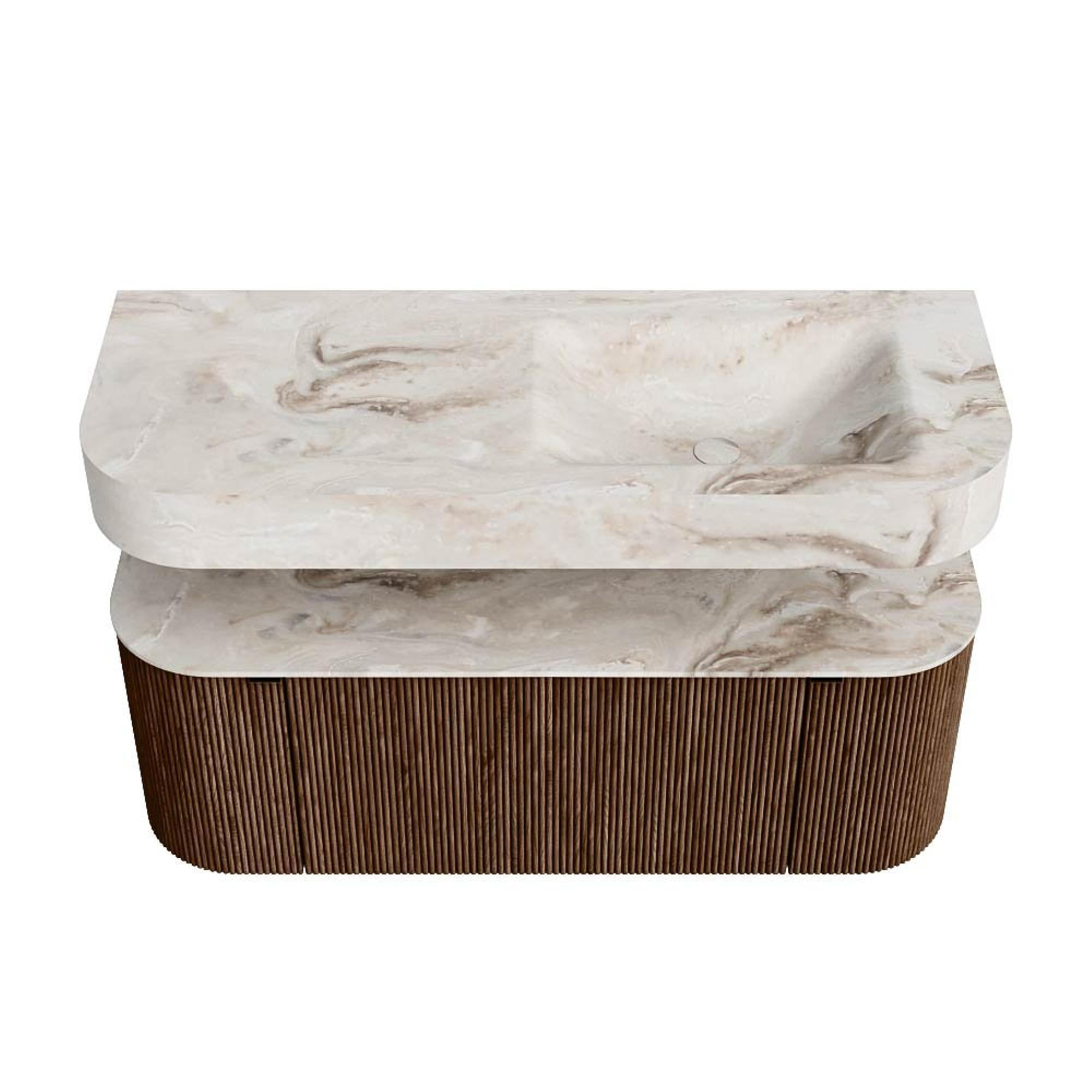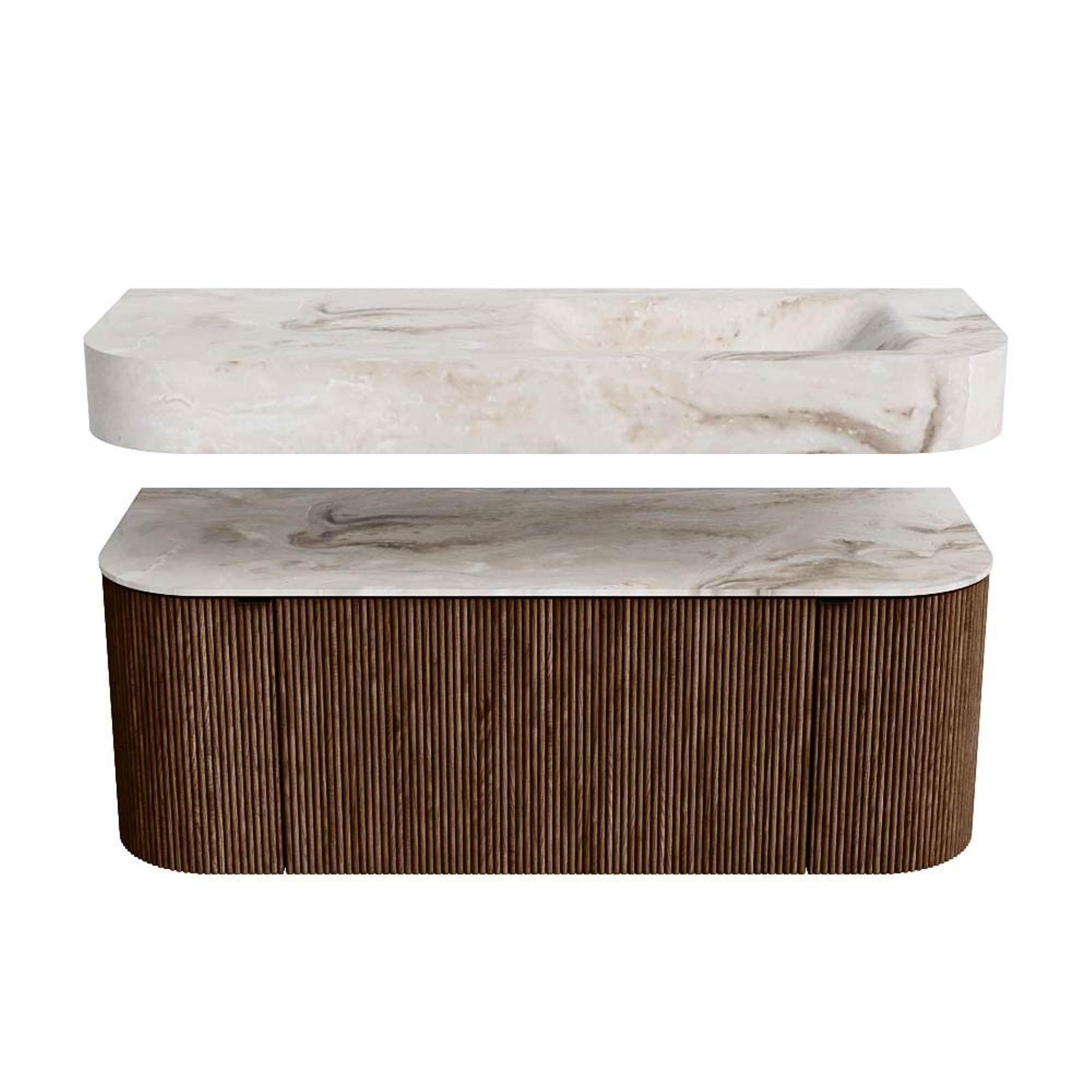 MONDIAZ THOR-DLUX 120cm badmeubel ronding links + rechts kleur Walnut met 1 lade en 2 deuren. Vrijhangende wastafel CLOUD Rechts 1 kraangat kleur Frappe.