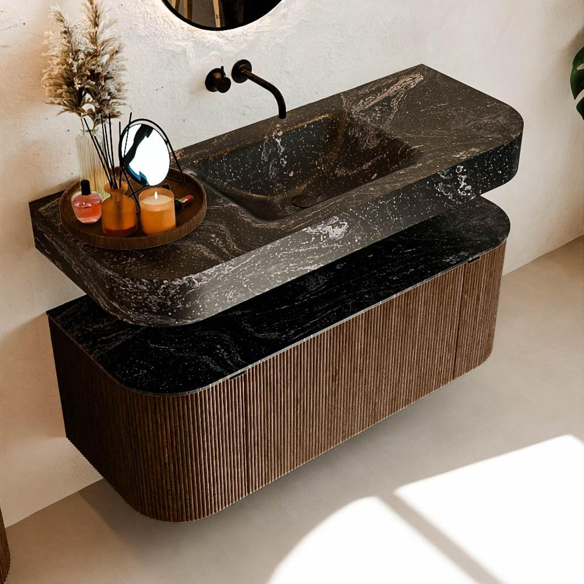 MONDIAZ THOR-DLUX 120cm badmeubel ronding links + rechts kleur Walnut met 1 lade en 2 deuren. Vrijhangende wastafel CLOUD Midden zonder kraangat kleur Lava.