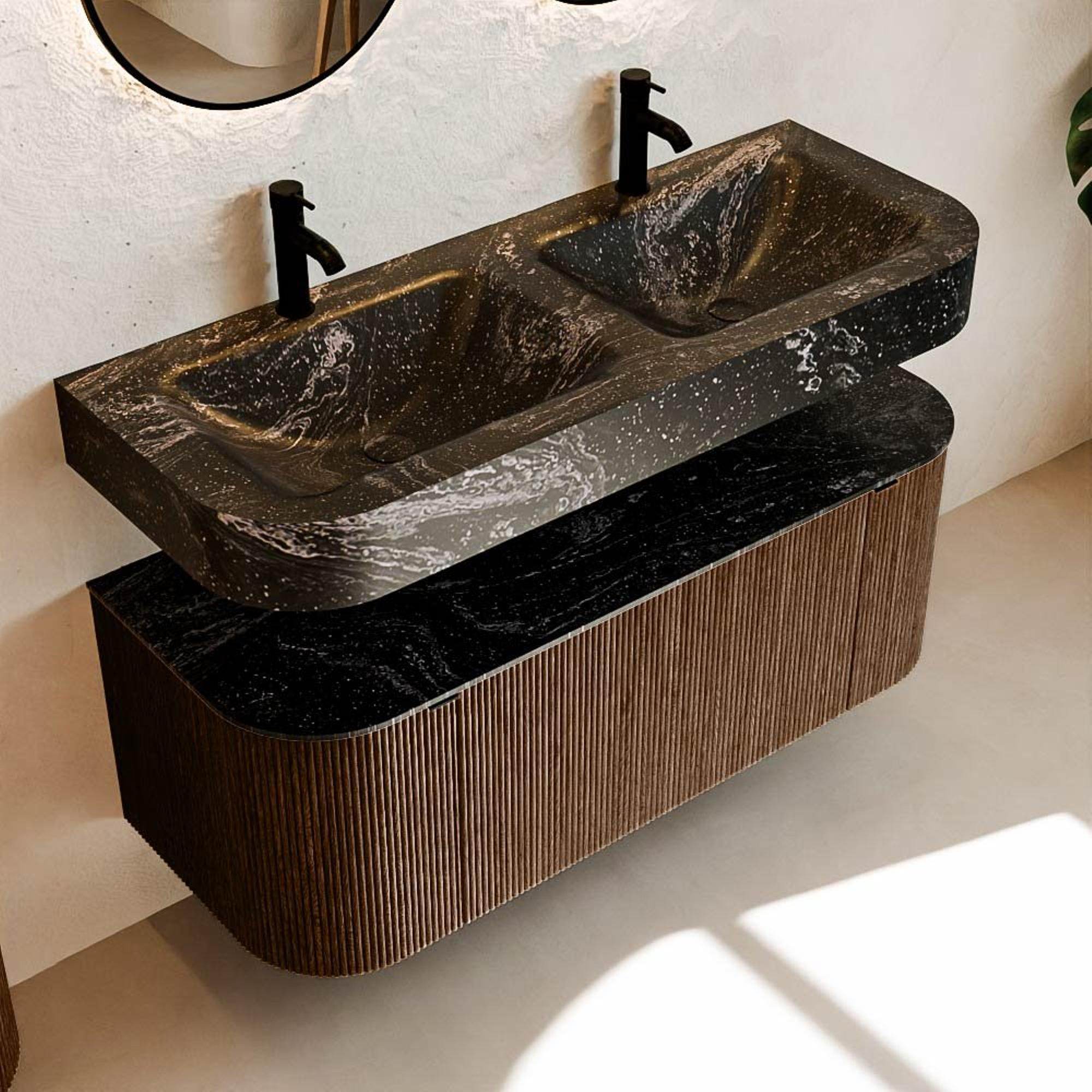 MONDIAZ THOR-DLUX 120cm badmeubel ronding links + rechts kleur Walnut met 1 lade en 2 deuren. Vrijhangende wastafel CLOUD Dubbel 2 kraangaten kleur Lava.