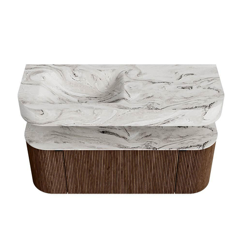 MONDIAZ THOR-DLUX 120cm badmeubel ronding links + rechts kleur Walnut met 1 lade en 2 deuren. Vrijhangende wastafel CLOUD Links zonder kraangat kleur Glace.