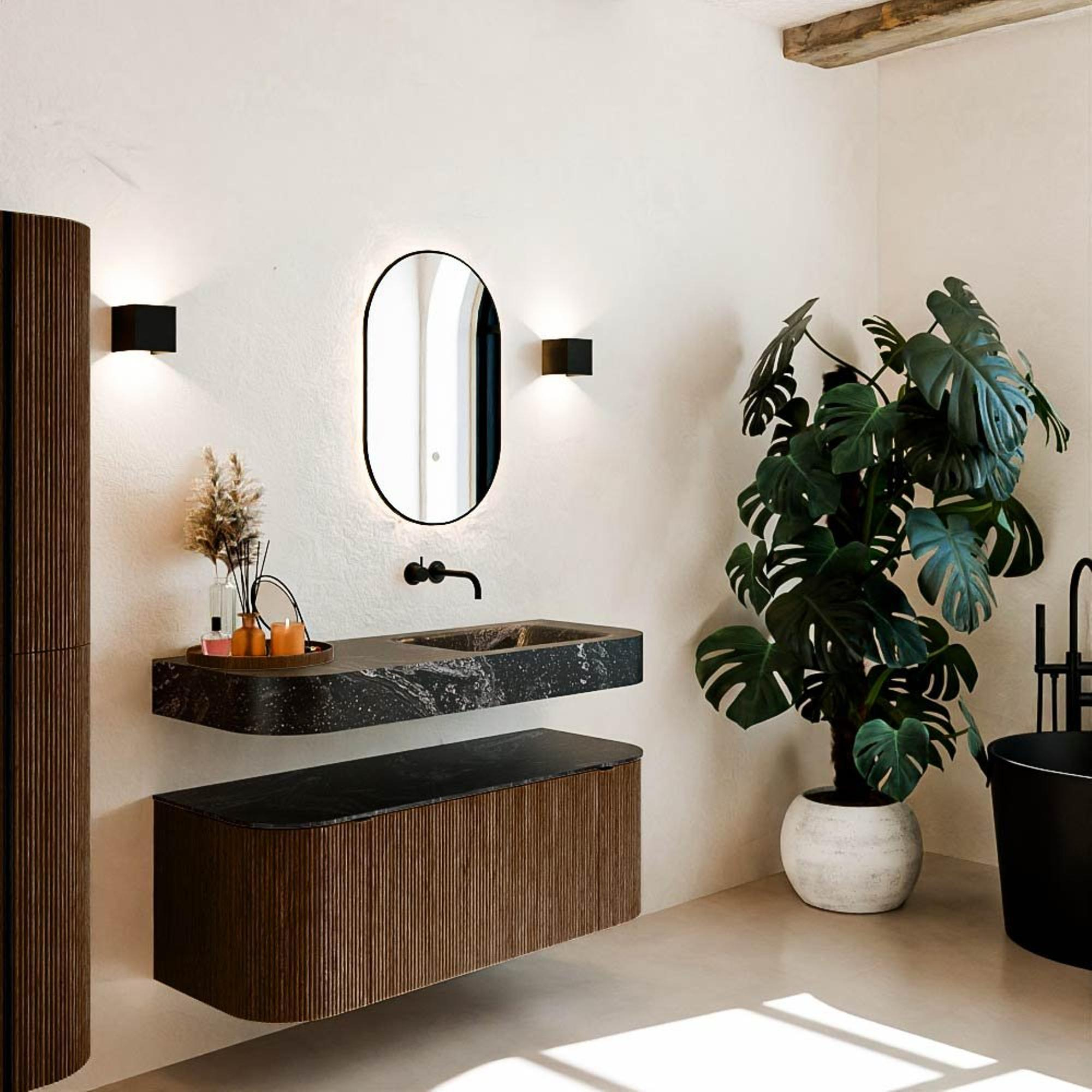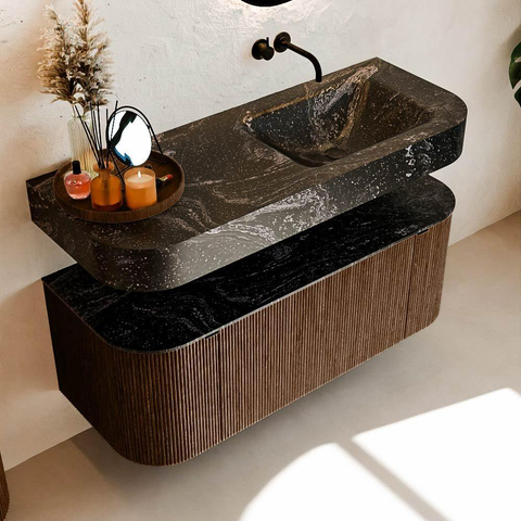 MONDIAZ THOR-DLUX 120cm badmeubel ronding links + rechts kleur Walnut met 1 lade en 2 deuren. Vrijhangende wastafel CLOUD Rechts zonder kraangat kleur Lava.
