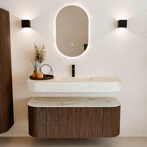 MONDIAZ THOR-DLUX 120cm badmeubel ronding links + rechts kleur Walnut met 1 lade en 2 deuren. Vrijhangende wastafel CLOUD Midden 1 kraangat kleur Ostra.