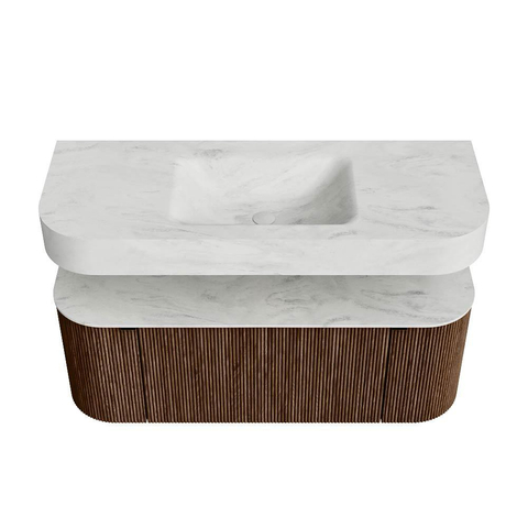 MONDIAZ THOR-DLUX 120cm badmeubel ronding links + rechts kleur Walnut met 1 lade en 2 deuren. Vrijhangende wastafel CLOUD Midden zonder kraangat kleur Opalo.