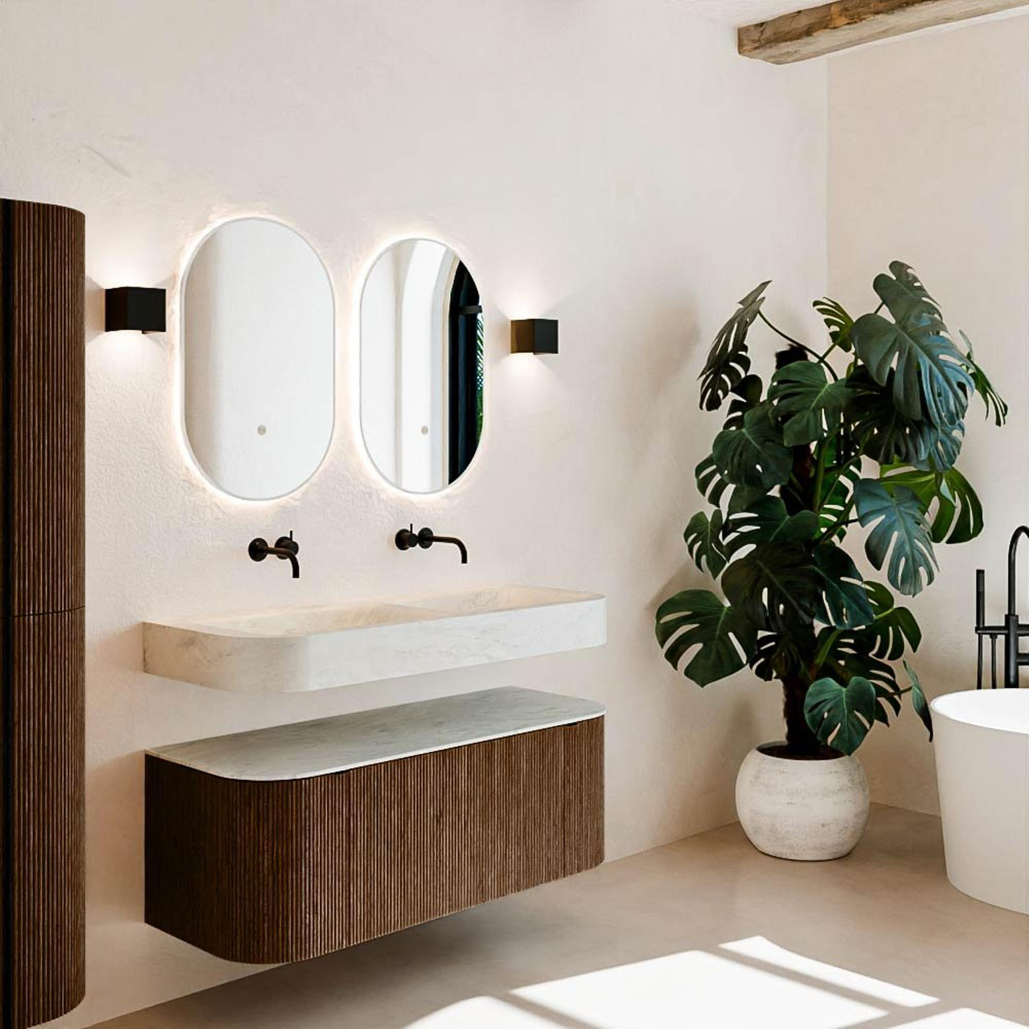 MONDIAZ THOR-DLUX 120cm badmeubel ronding links + rechts kleur Walnut met 1 lade en 2 deuren. Vrijhangende wastafel CLOUD Dubbel zonder kraangat kleur Opalo.