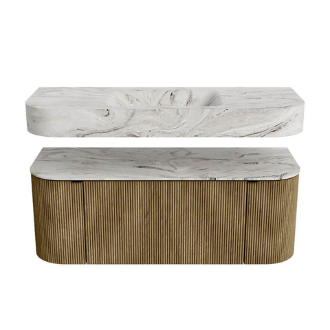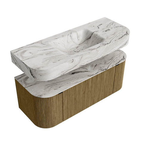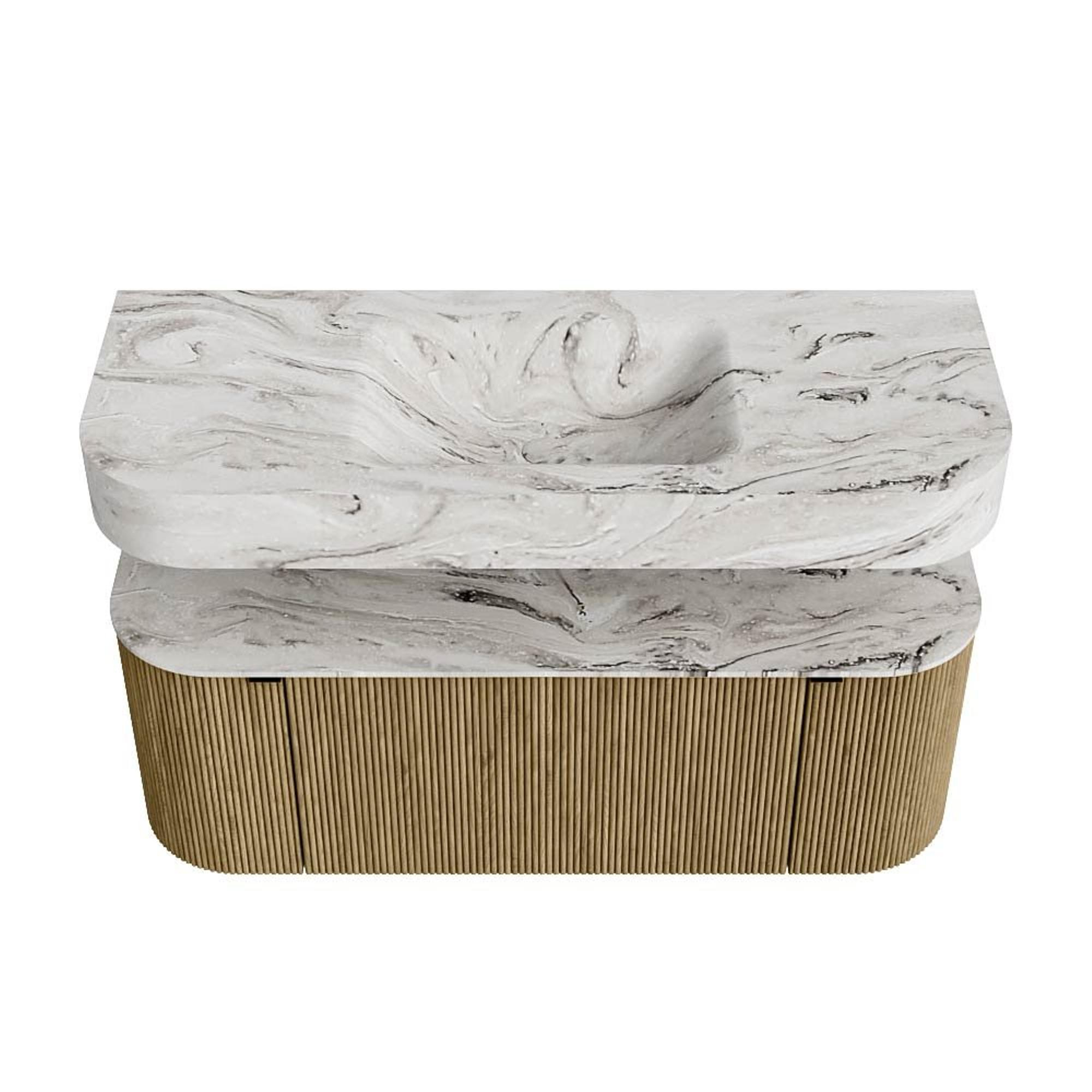 MONDIAZ THOR-DLUX 120cm badmeubel ronding links + rechts kleur Dusk met 1 lade en 2 deuren. Vrijhangende wastafel CLOUD Midden 1 kraangat kleur Glace.