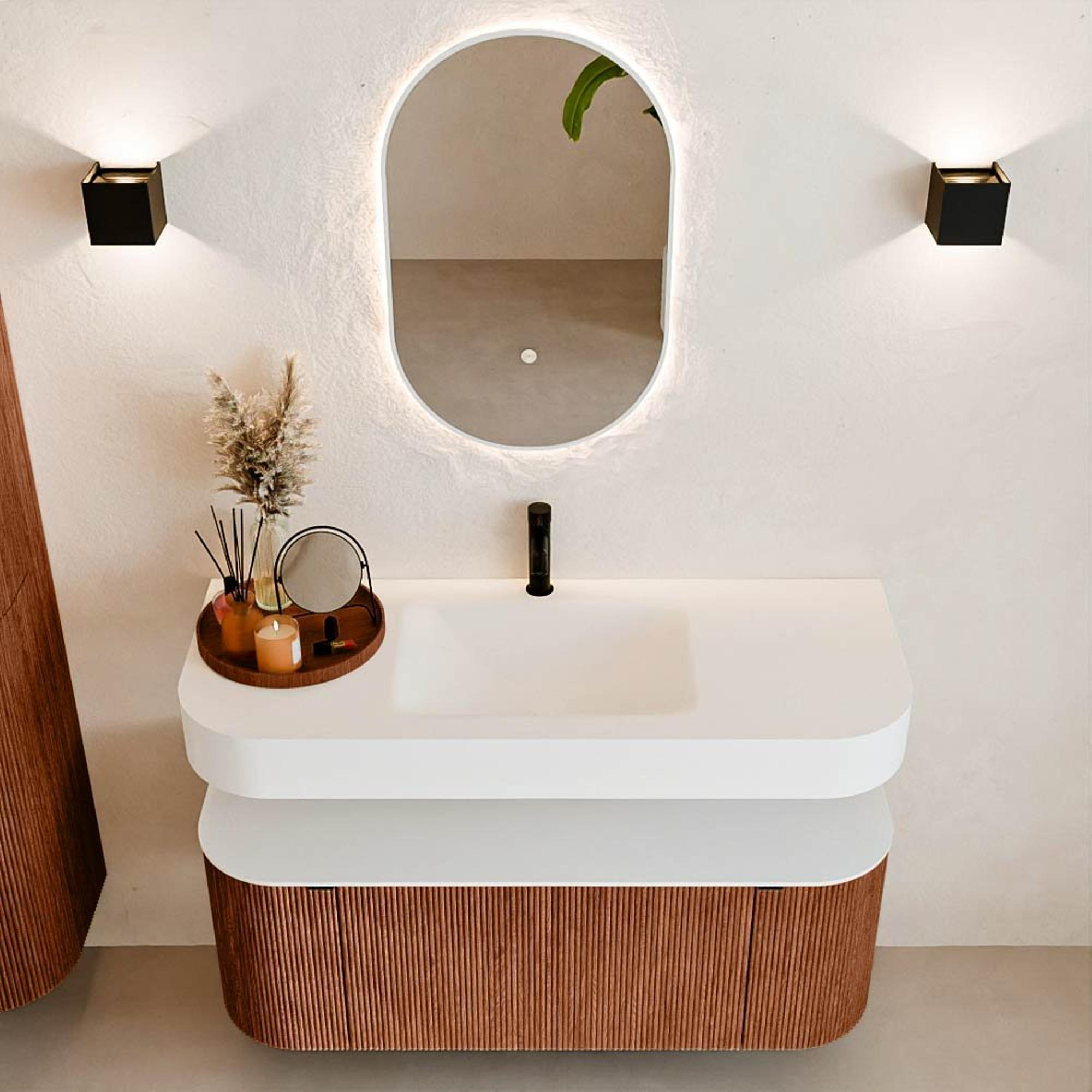 Natuurlijke materialen in warme tinten. De verticale ribbels brengen ritme en textuur in het ontwerp, terwijl het eikenhout zorgt voor een warme, ambachtelijke uitstraling. Kies uit 5 houttinten OAK, WALNUT, DUSK, SHADOW en RUBY zorgvuldig geselecteerde houtkleuren om zowel moderne als klassieke badkamers te verrijken.
