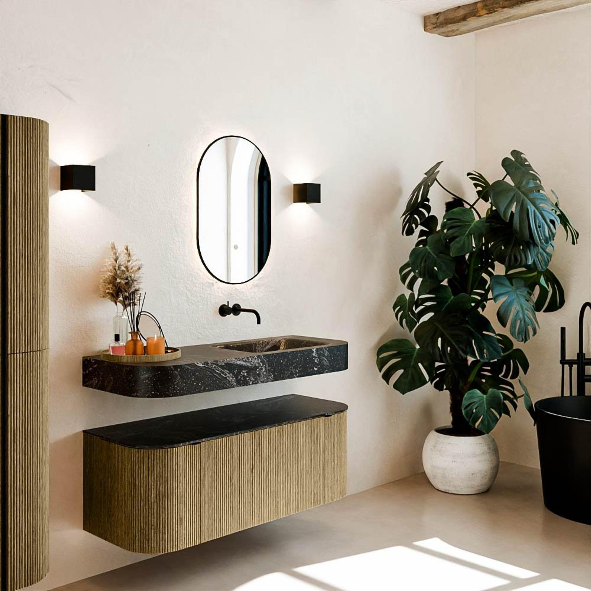 Natuurlijke materialen in warme tinten. De verticale ribbels brengen ritme en textuur in het ontwerp, terwijl het eikenhout zorgt voor een warme, ambachtelijke uitstraling. Kies uit 5 houttinten OAK, WALNUT, DUSK, SHADOW en RUBY zorgvuldig geselecteerde houtkleuren om zowel moderne als klassieke badkamers te verrijken.