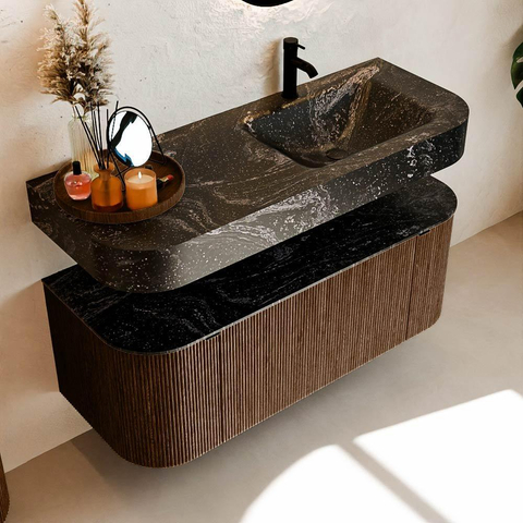 MONDIAZ THOR-DLUX 120cm badmeubel ronding links + rechts kleur Walnut met 1 lade en 2 deuren. Vrijhangende wastafel CLOUD Rechts 1 kraangat kleur Lava.