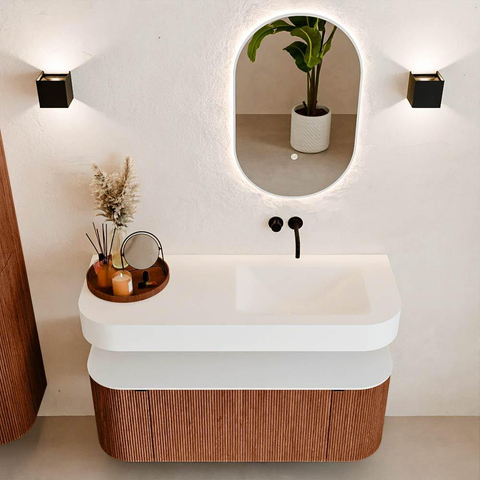 Boven het meubel zweeft een bijpassende, vrij hangende wastafel met afgeronde hoeken – perfect afgestemd op de vorm van de kast. De wastafel is uitgevoerd in Solid Surface en volgt subtiel de lijnen van het onderliggende meubel, waardoor een harmonieus geheel ontstaat. Het Solid Surface topblad vormt een sterke, onderhoudsvriendelijke basis en maakt de combinatie compleet.