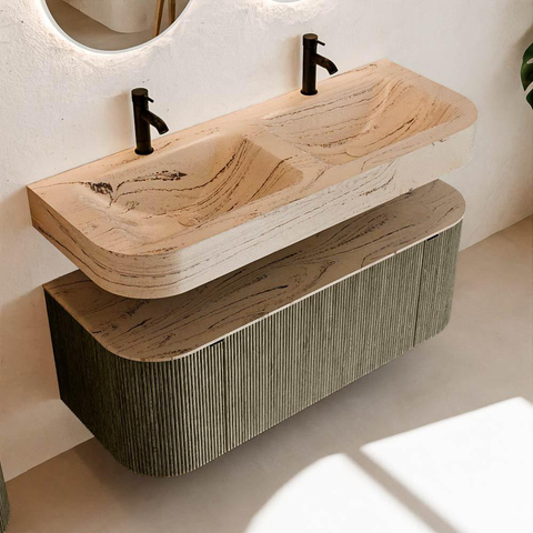 Natuurlijke materialen in warme tinten. De verticale ribbels brengen ritme en textuur in het ontwerp, terwijl het eikenhout zorgt voor een warme, ambachtelijke uitstraling. Kies uit 5 houttinten OAK, WALNUT, DUSK, SHADOW en RUBY zorgvuldig geselecteerde houtkleuren om zowel moderne als klassieke badkamers te verrijken.