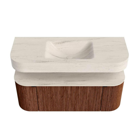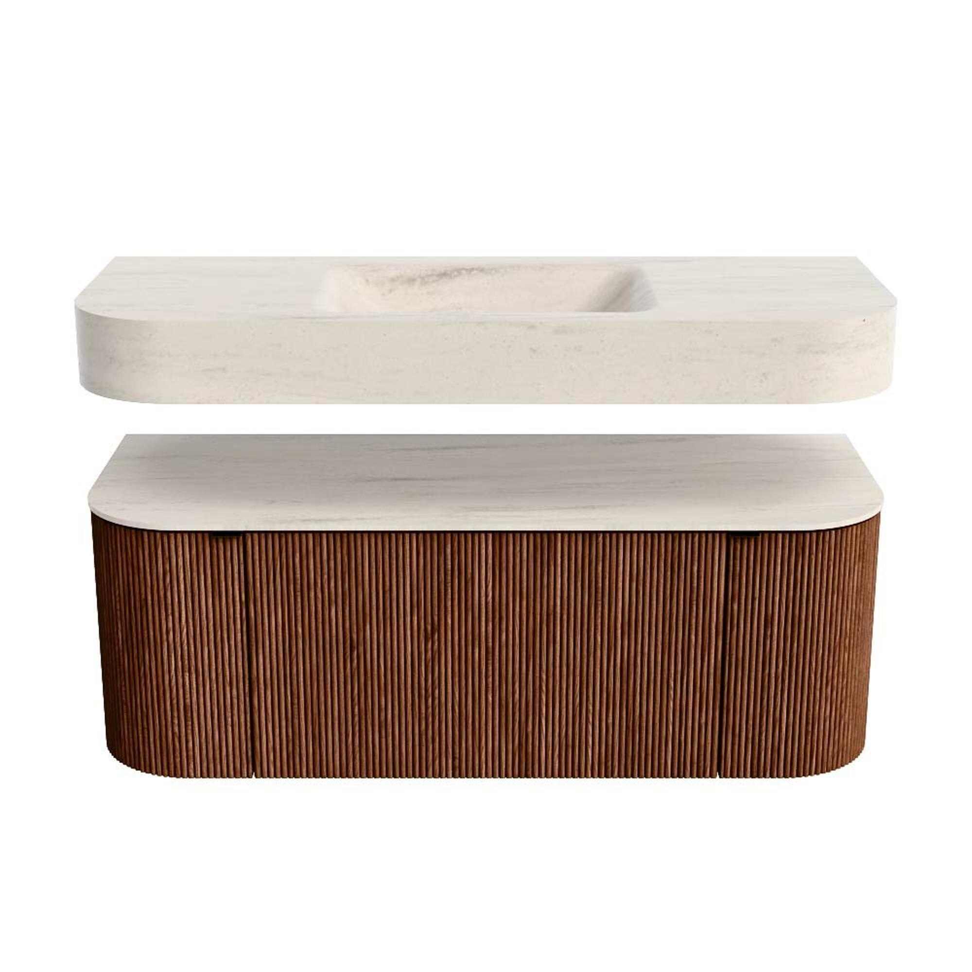 MONDIAZ THOR-DLUX 120cm badmeubel ronding links + rechts kleur Ruby met 1 lade en 2 deuren. Vrijhangende wastafel CLOUD Midden zonder kraangat kleur Meli.