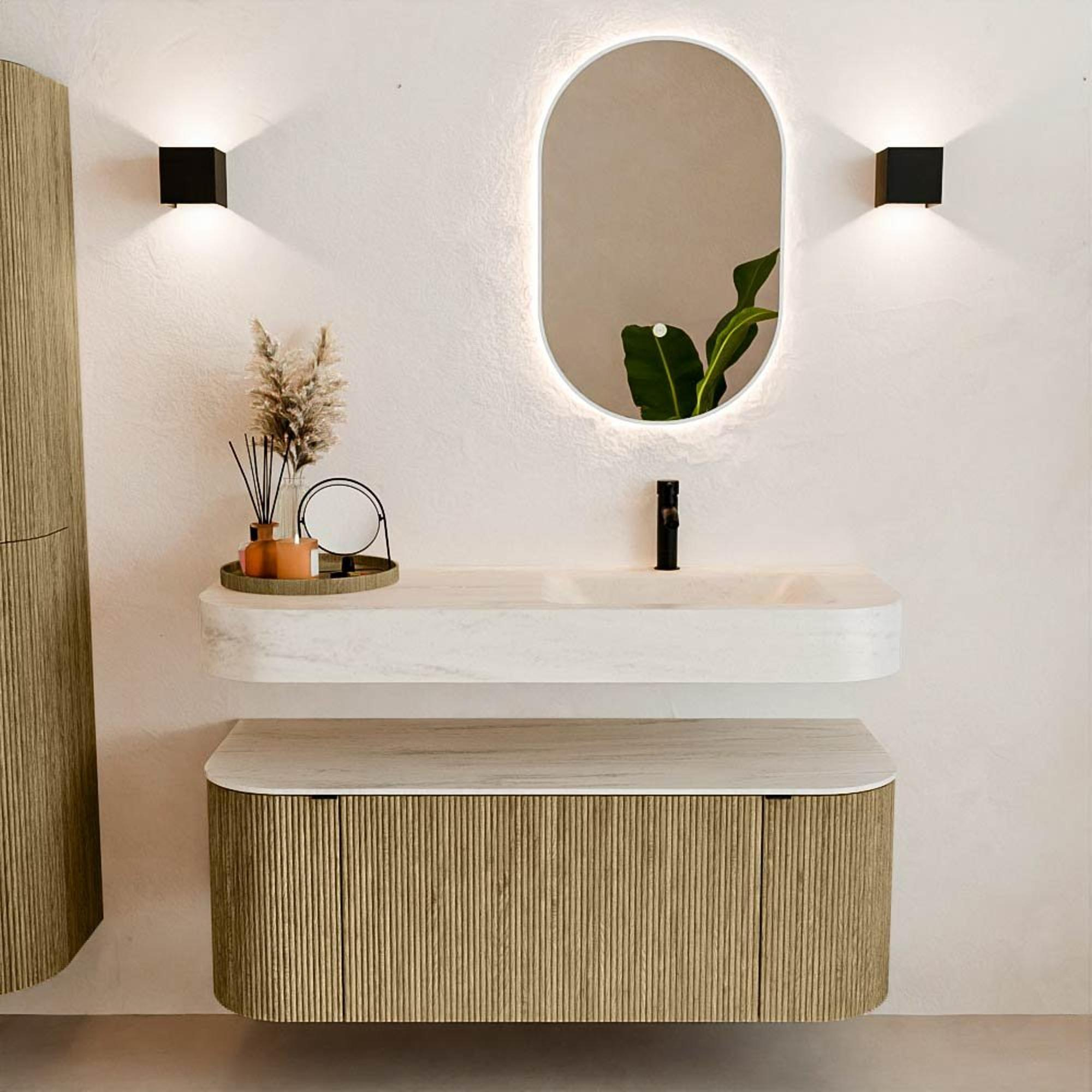 Natuurlijke materialen in warme tinten. De verticale ribbels brengen ritme en textuur in het ontwerp, terwijl het eikenhout zorgt voor een warme, ambachtelijke uitstraling. Kies uit 5 houttinten OAK, WALNUT, DUSK, SHADOW en RUBY zorgvuldig geselecteerde houtkleuren om zowel moderne als klassieke badkamers te verrijken.