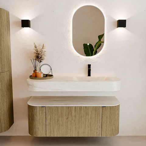 Boven het meubel zweeft een bijpassende, vrij hangende wastafel met afgeronde hoeken – perfect afgestemd op de vorm van de kast. De wastafel is uitgevoerd in Solid Surface en volgt subtiel de lijnen van het onderliggende meubel, waardoor een harmonieus geheel ontstaat. Het Solid Surface topblad vormt een sterke, onderhoudsvriendelijke basis en maakt de combinatie compleet.