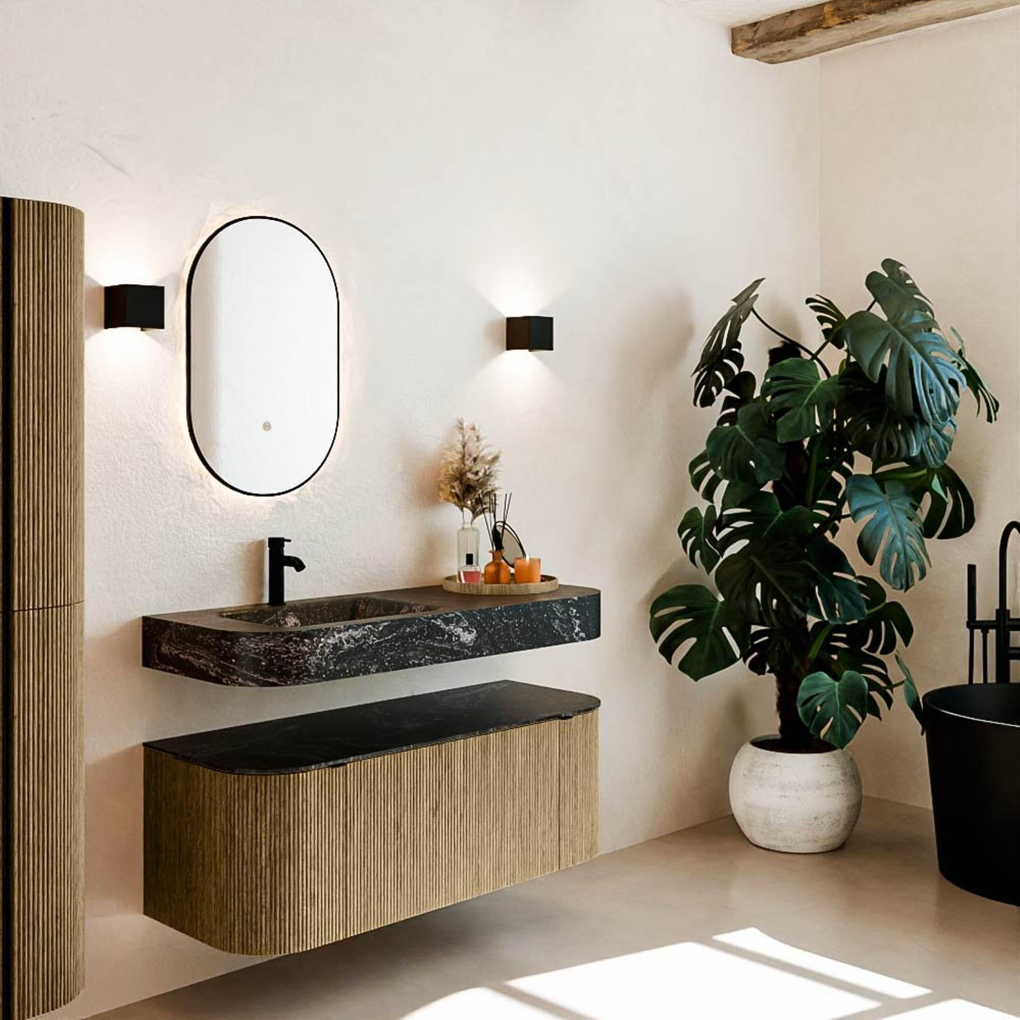 Natuurlijke materialen in warme tinten. De verticale ribbels brengen ritme en textuur in het ontwerp, terwijl het eikenhout zorgt voor een warme, ambachtelijke uitstraling. Kies uit 5 houttinten OAK, WALNUT, DUSK, SHADOW en RUBY zorgvuldig geselecteerde houtkleuren om zowel moderne als klassieke badkamers te verrijken.