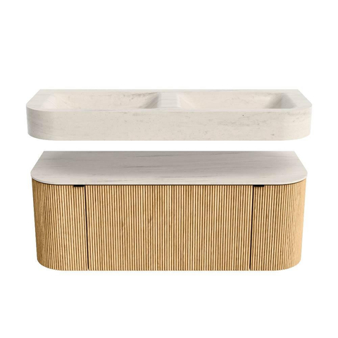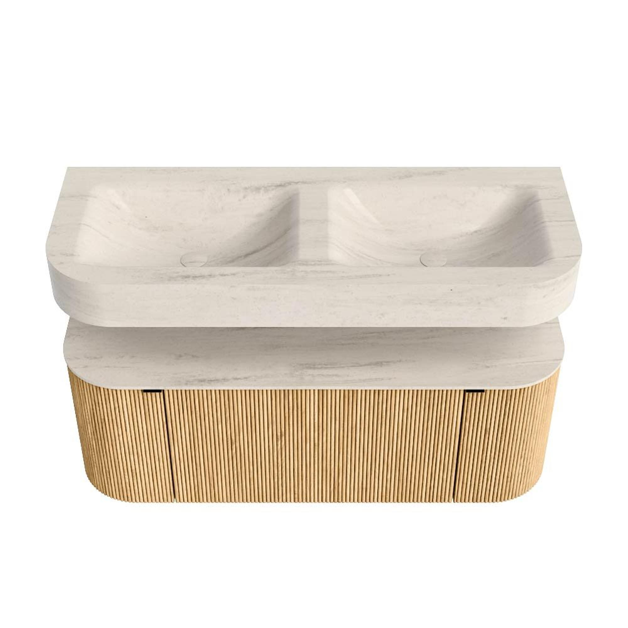 MONDIAZ THOR-DLUX 120cm badmeubel ronding links + rechts kleur Oak met 1 lade en 2 deuren. Vrijhangende wastafel CLOUD Dubbel 2 kraangaten kleur Meli.