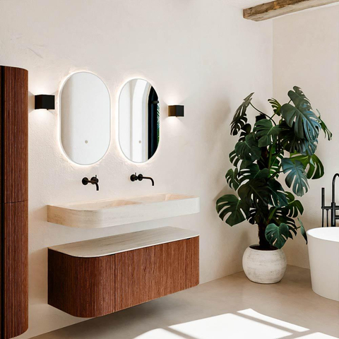 Natuurlijke materialen in warme tinten. De verticale ribbels brengen ritme en textuur in het ontwerp, terwijl het eikenhout zorgt voor een warme, ambachtelijke uitstraling. Kies uit 5 houttinten OAK, WALNUT, DUSK, SHADOW en RUBY zorgvuldig geselecteerde houtkleuren om zowel moderne als klassieke badkamers te verrijken.