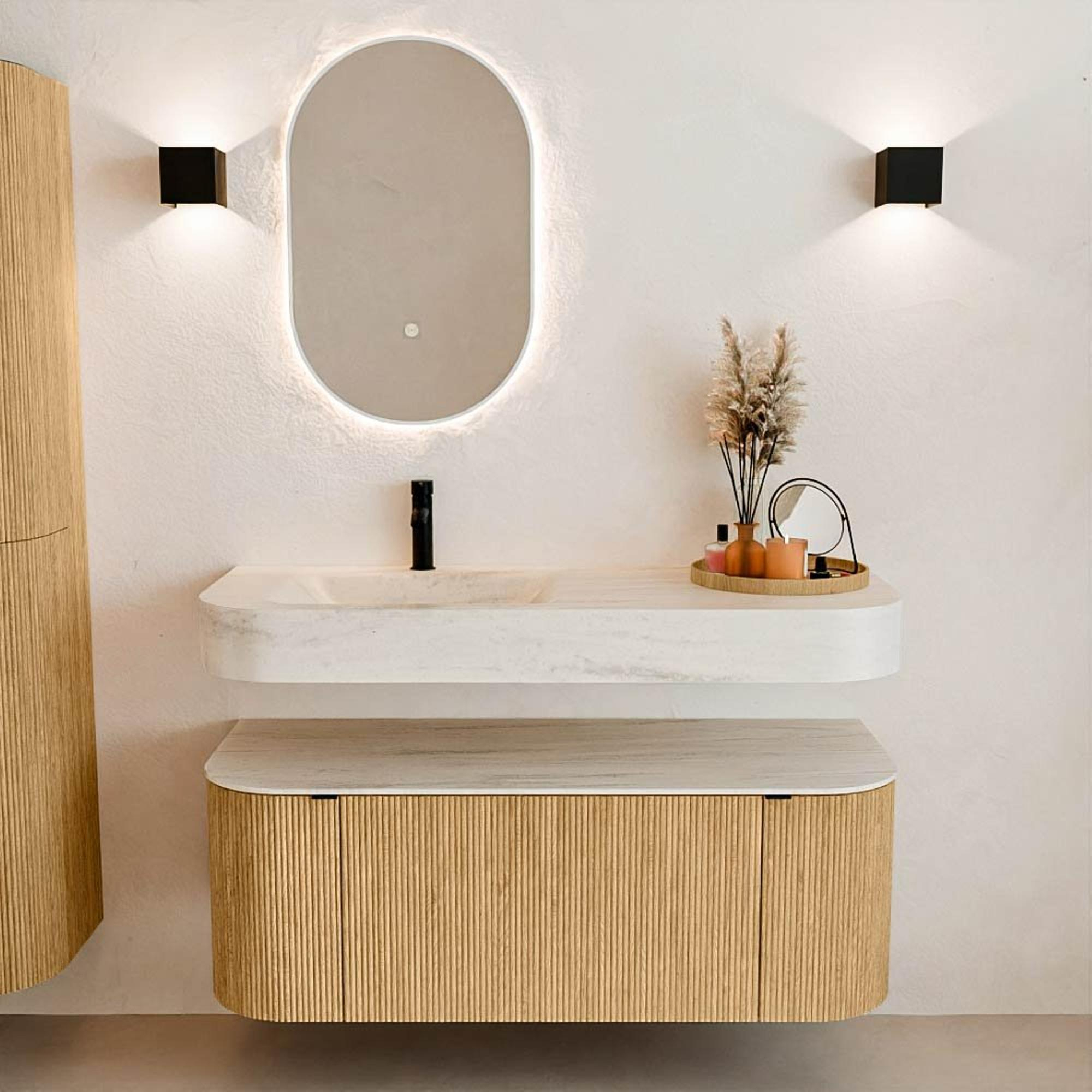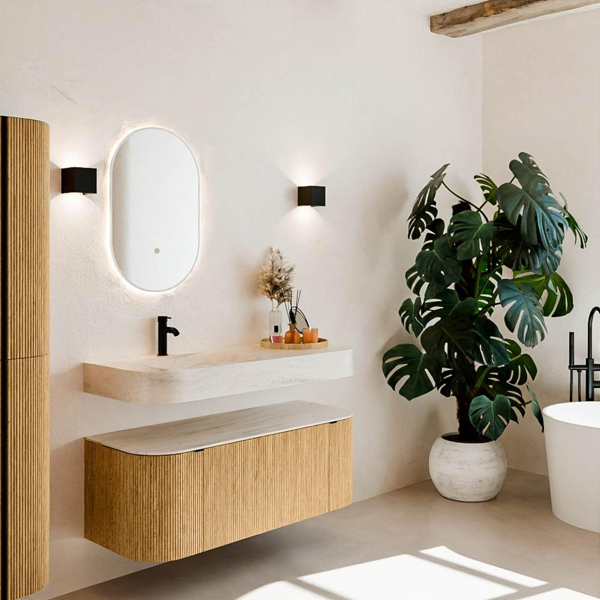 Natuurlijke materialen in warme tinten. De verticale ribbels brengen ritme en textuur in het ontwerp, terwijl het eikenhout zorgt voor een warme, ambachtelijke uitstraling. Kies uit 5 houttinten OAK, WALNUT, DUSK, SHADOW en RUBY zorgvuldig geselecteerde houtkleuren om zowel moderne als klassieke badkamers te verrijken.