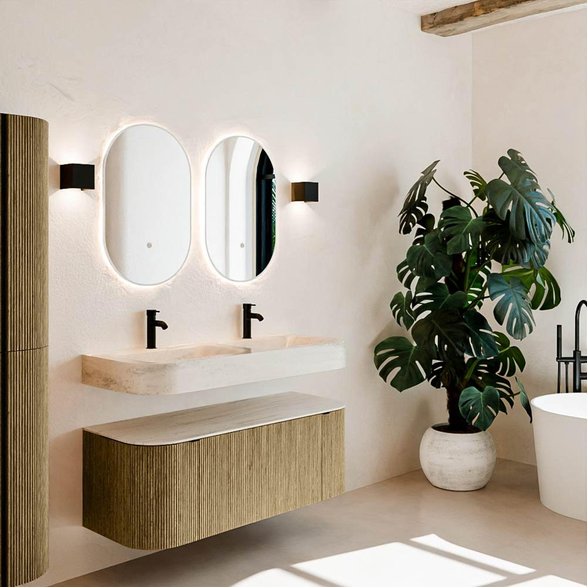 Natuurlijke materialen in warme tinten. De verticale ribbels brengen ritme en textuur in het ontwerp, terwijl het eikenhout zorgt voor een warme, ambachtelijke uitstraling. Kies uit 5 houttinten OAK, WALNUT, DUSK, SHADOW en RUBY zorgvuldig geselecteerde houtkleuren om zowel moderne als klassieke badkamers te verrijken.