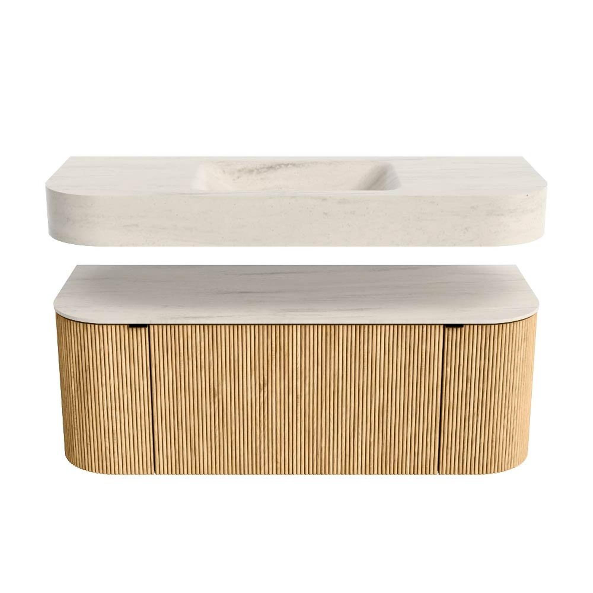 Boven het meubel zweeft een bijpassende, vrij hangende wastafel met afgeronde hoeken – perfect afgestemd op de vorm van de kast. De wastafel is uitgevoerd in Solid Surface en volgt subtiel de lijnen van het onderliggende meubel, waardoor een harmonieus geheel ontstaat. Het Solid Surface topblad vormt een sterke, onderhoudsvriendelijke basis en maakt de combinatie compleet.