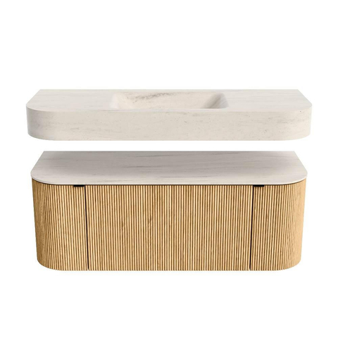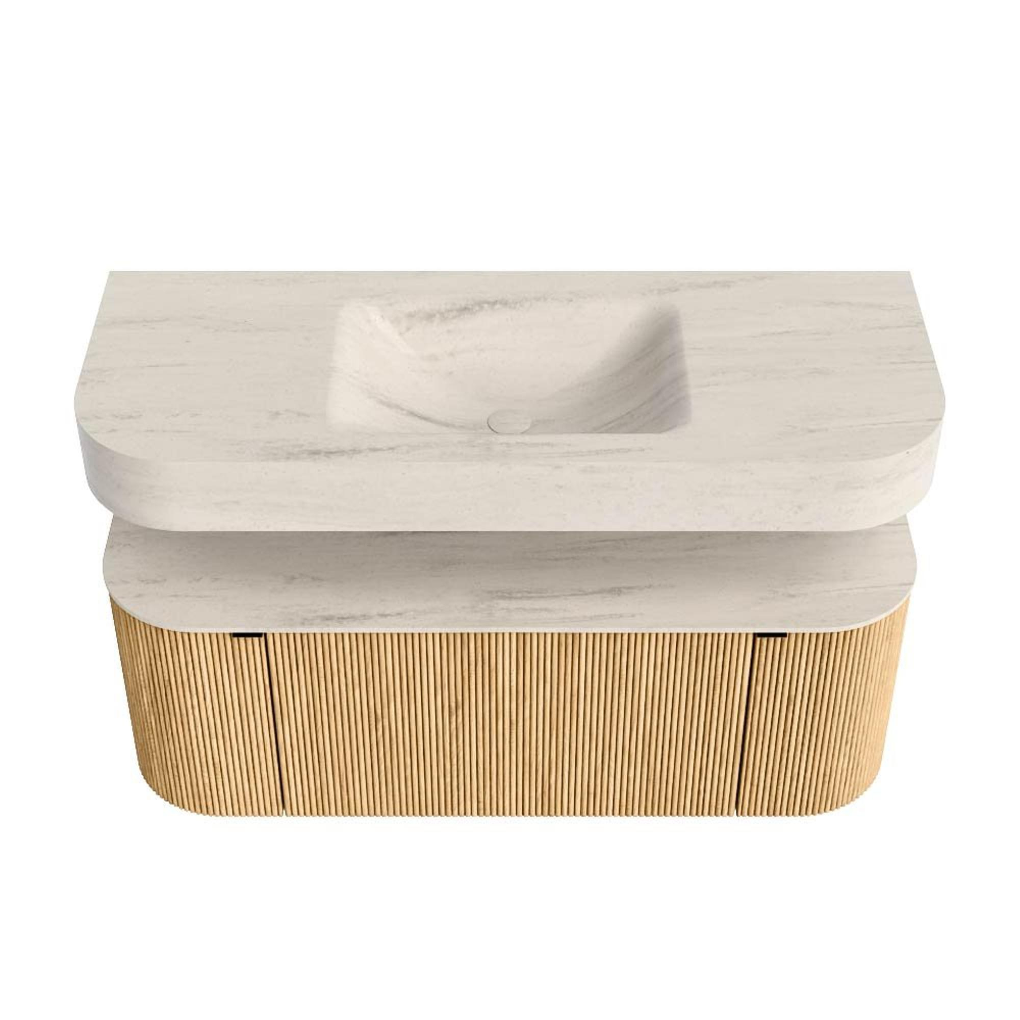 MONDIAZ THOR-DLUX 120cm badmeubel ronding links + rechts kleur Oak met 1 lade en 2 deuren. Vrijhangende wastafel CLOUD Midden 1 kraangat kleur Meli.