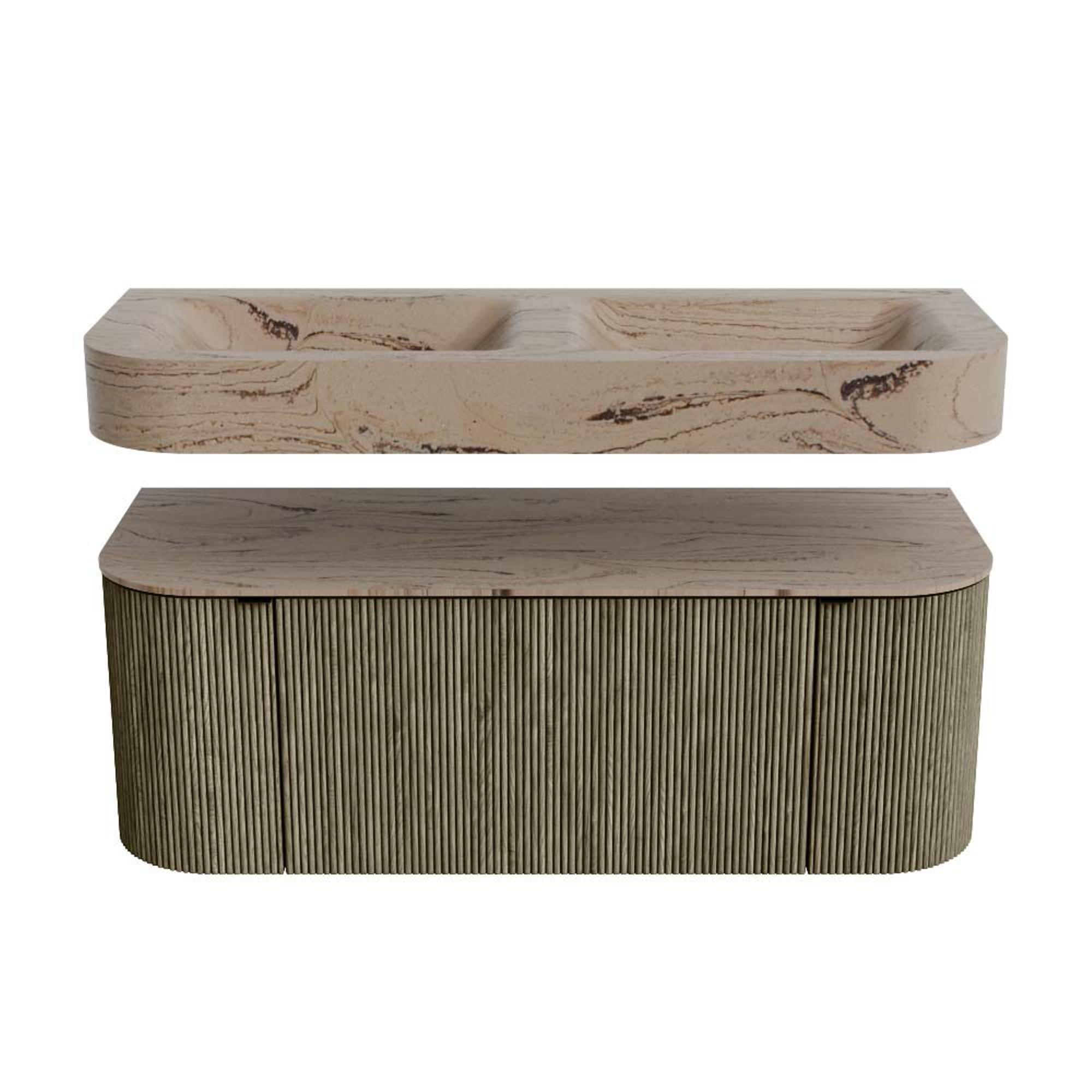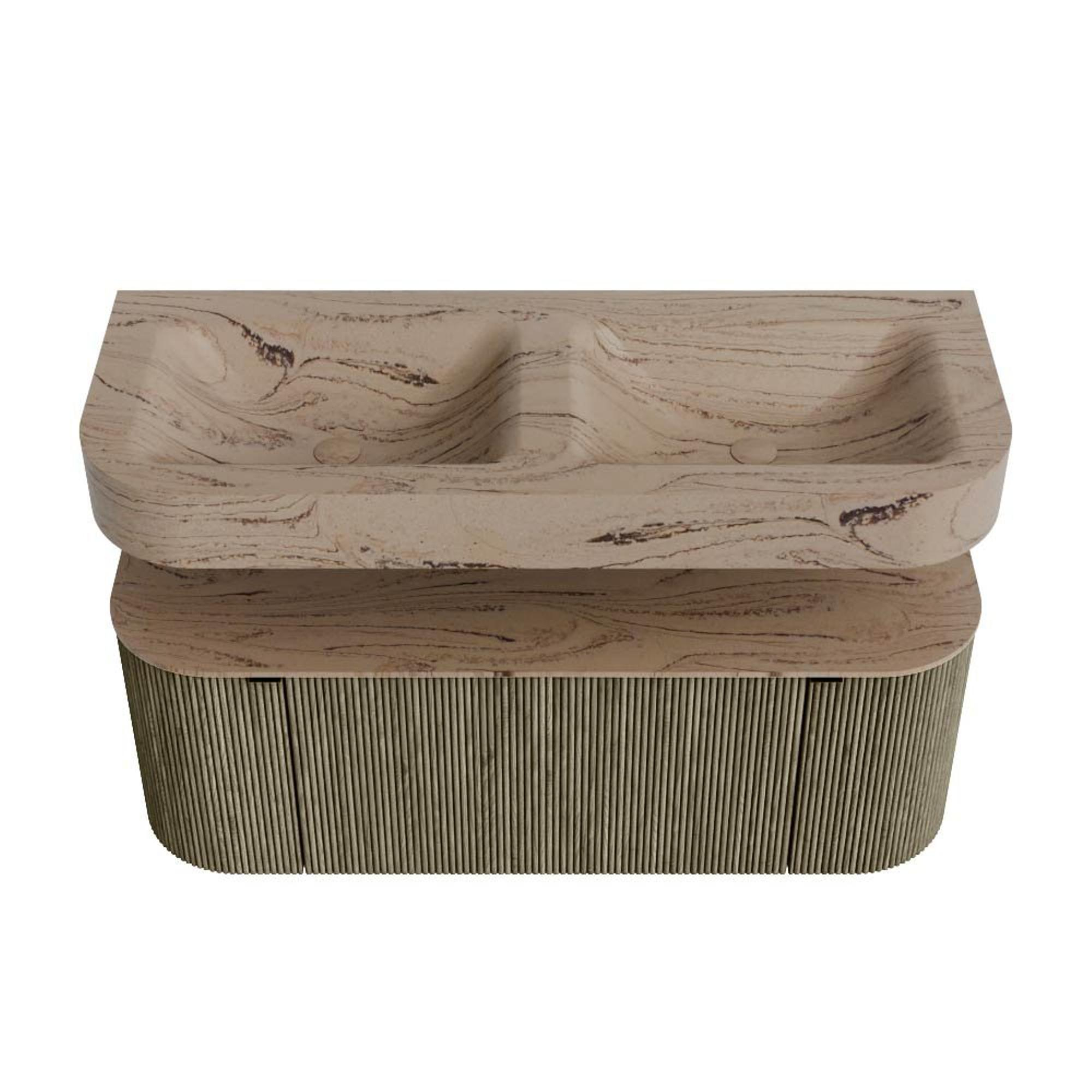 Boven het meubel zweeft een bijpassende, vrij hangende wastafel met afgeronde hoeken – perfect afgestemd op de vorm van de kast. De wastafel is uitgevoerd in Solid Surface en volgt subtiel de lijnen van het onderliggende meubel, waardoor een harmonieus geheel ontstaat. Het Solid Surface topblad vormt een sterke, onderhoudsvriendelijke basis en maakt de combinatie compleet.