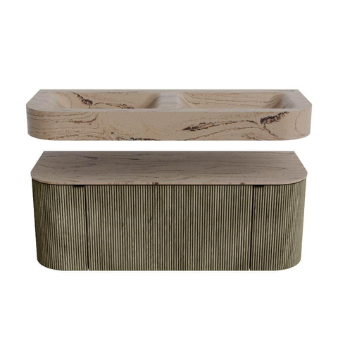 MONDIAZ THOR-DLUX 120cm badmeubel ronding links + rechts kleur Shadow met 1 lade en 2 deuren. Vrijhangende wastafel CLOUD Dubbel zonder kraangat kleur Arena.