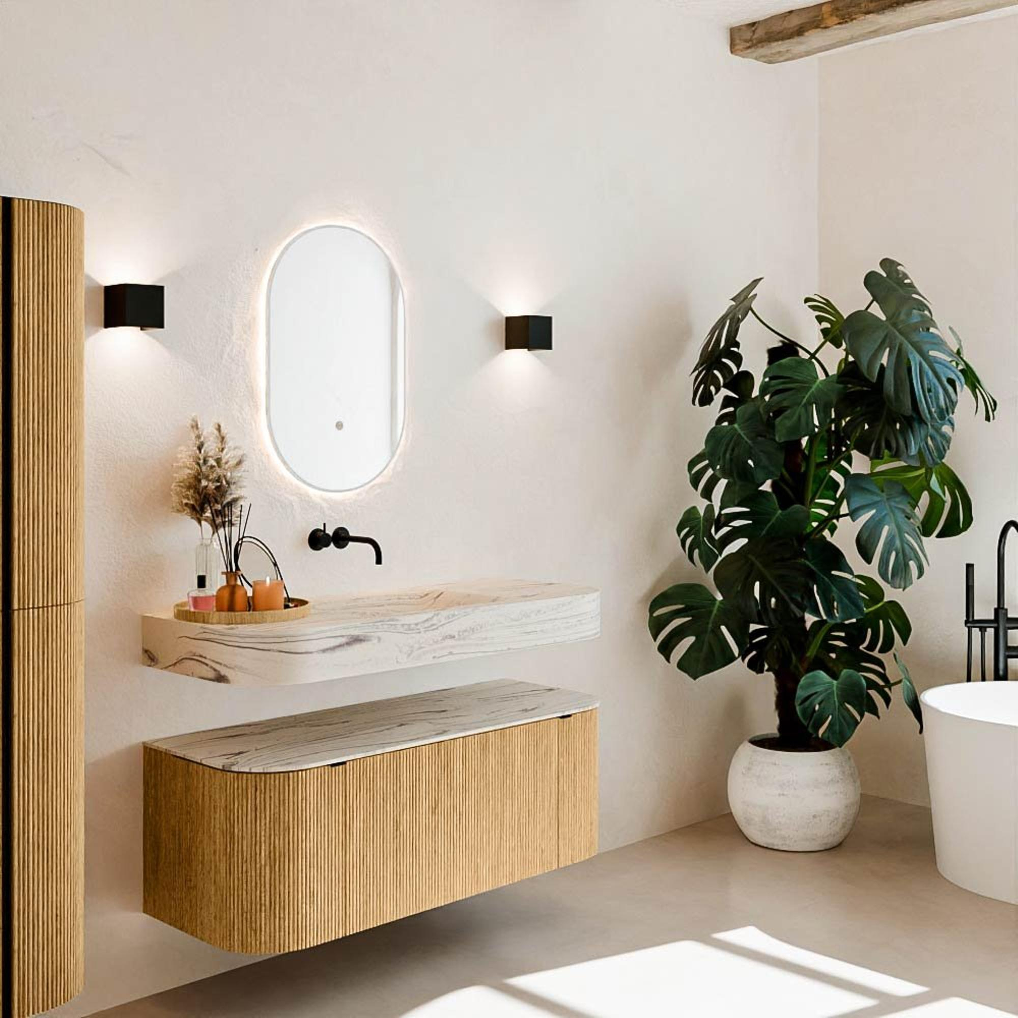 Natuurlijke materialen in warme tinten. De verticale ribbels brengen ritme en textuur in het ontwerp, terwijl het eikenhout zorgt voor een warme, ambachtelijke uitstraling. Kies uit 5 houttinten OAK, WALNUT, DUSK, SHADOW en RUBY zorgvuldig geselecteerde houtkleuren om zowel moderne als klassieke badkamers te verrijken.