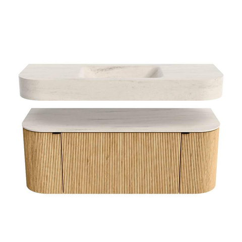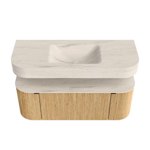 MONDIAZ THOR-DLUX 120cm badmeubel ronding links + rechts kleur Oak met 1 lade en 2 deuren. Vrijhangende wastafel CLOUD Midden zonder kraangat kleur Meli.