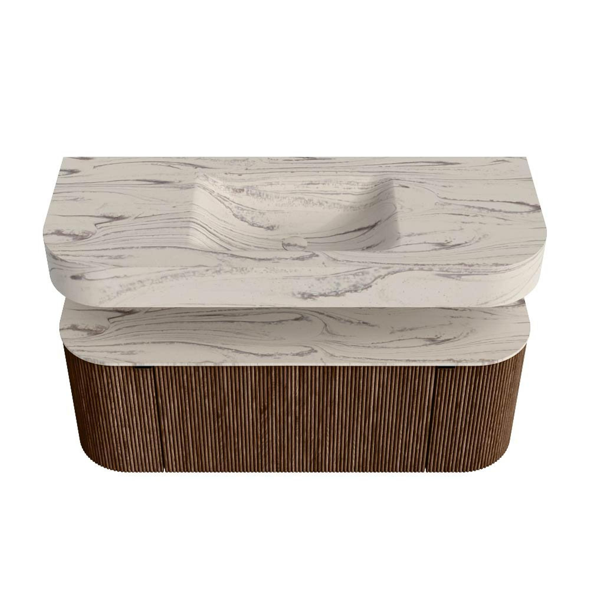 MONDIAZ THOR-DLUX 120cm badmeubel ronding links + rechts kleur Walnut met 1 lade en 2 deuren. Vrijhangende wastafel CLOUD Midden zonder kraangat kleur Nata.
