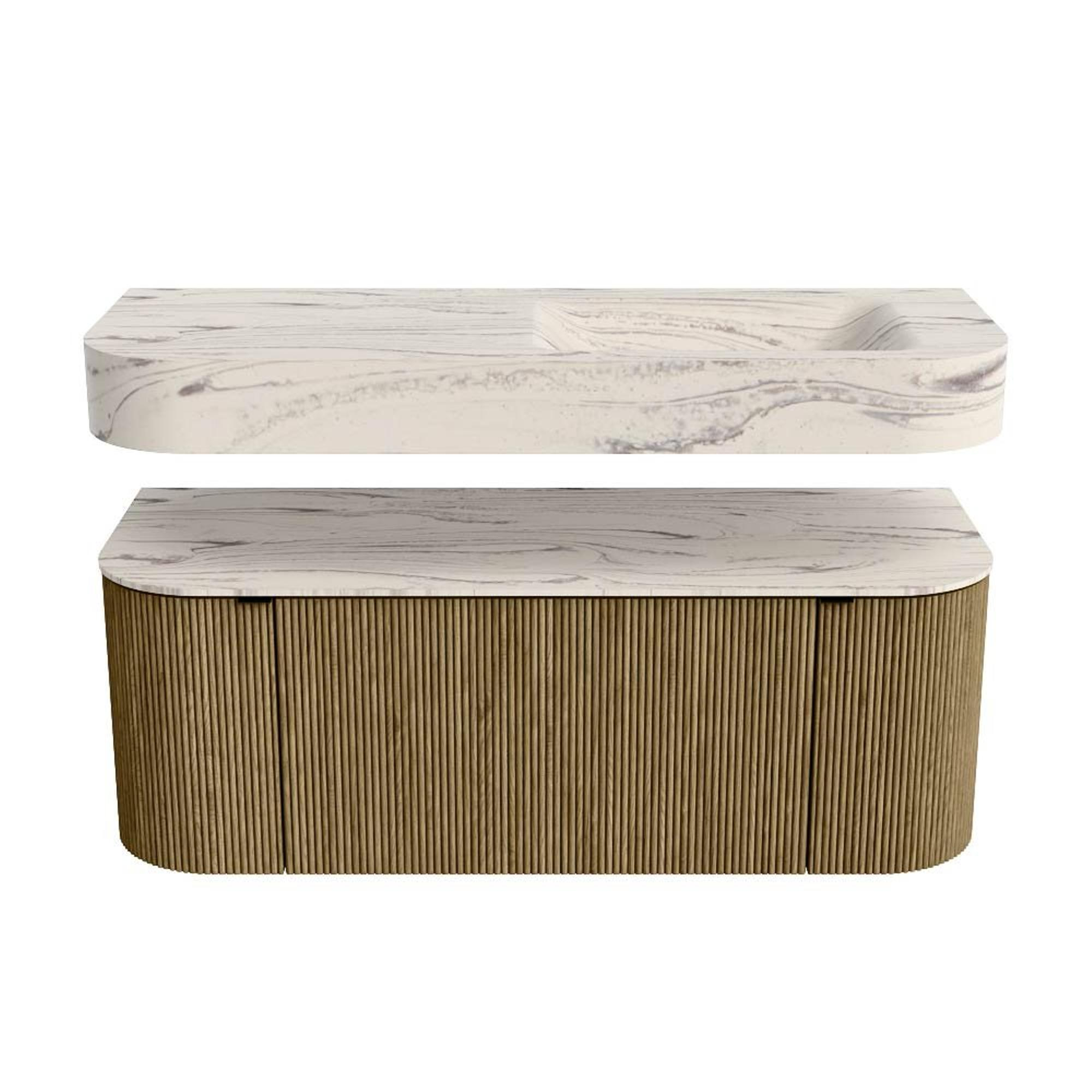 Boven het meubel zweeft een bijpassende, vrij hangende wastafel met afgeronde hoeken – perfect afgestemd op de vorm van de kast. De wastafel is uitgevoerd in Solid Surface en volgt subtiel de lijnen van het onderliggende meubel, waardoor een harmonieus geheel ontstaat. Het Solid Surface topblad vormt een sterke, onderhoudsvriendelijke basis en maakt de combinatie compleet.