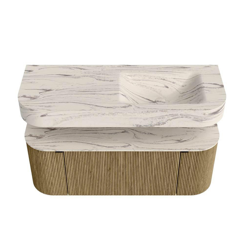 MONDIAZ THOR-DLUX 120cm badmeubel ronding links + rechts kleur Dusk met 1 lade en 2 deuren. Vrijhangende wastafel CLOUD Rechts 1 kraangat kleur Nata.
