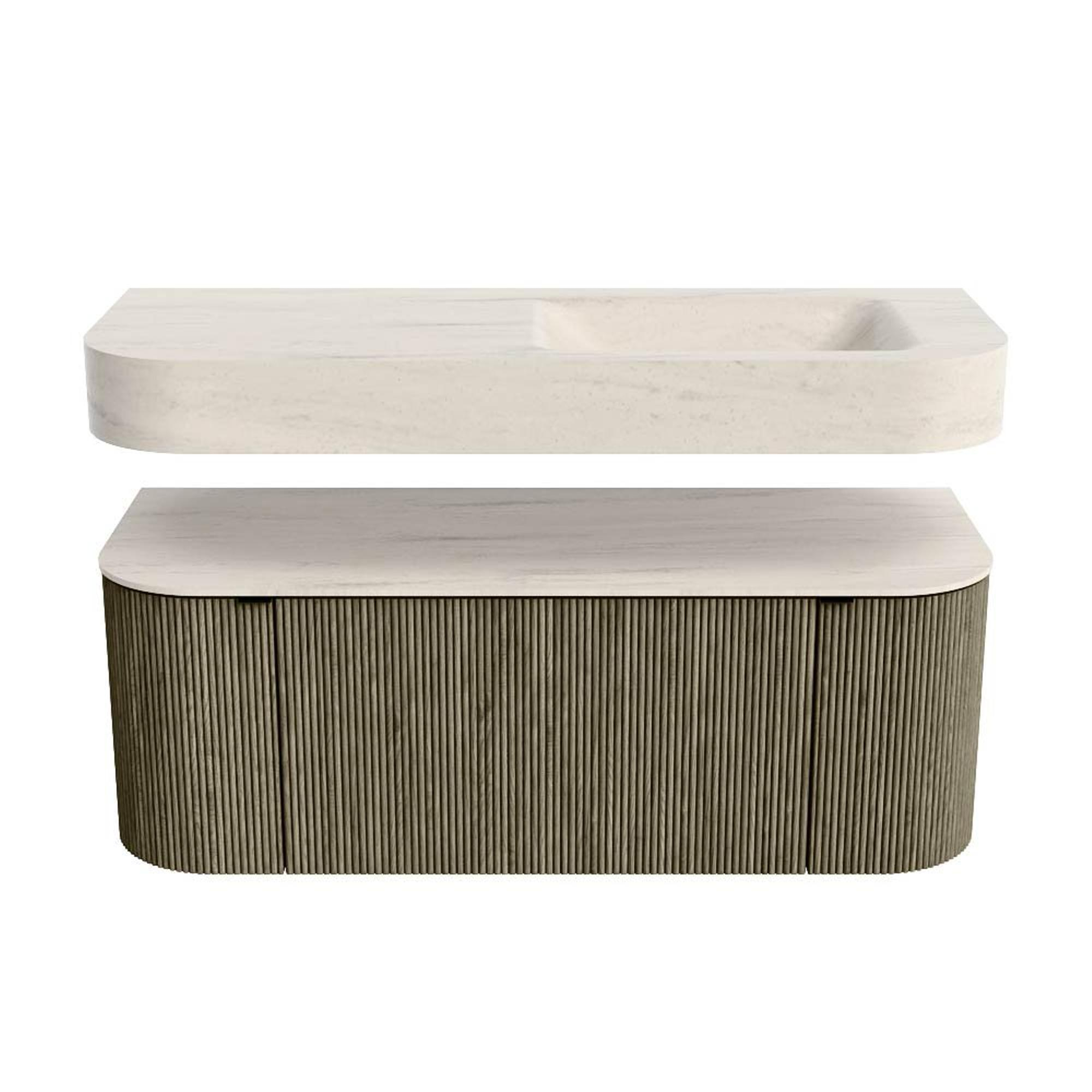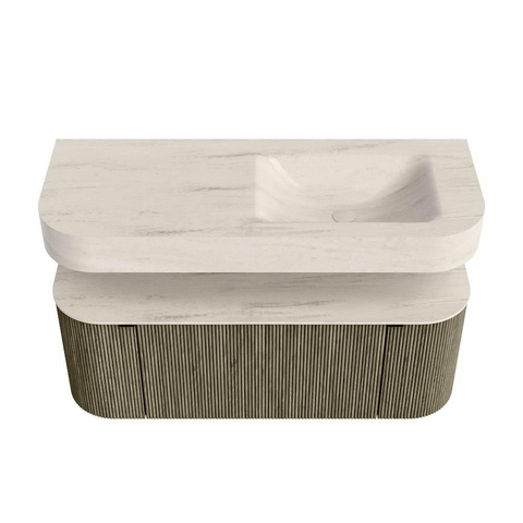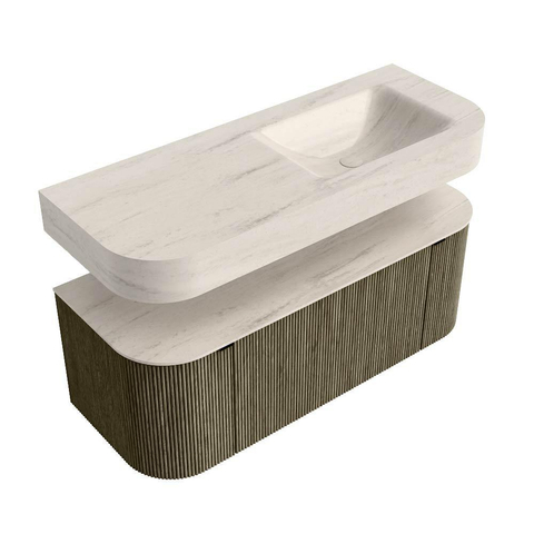 MONDIAZ THOR-DLUX 120cm badmeubel ronding links + rechts kleur Shadow met 1 lade en 2 deuren. Vrijhangende wastafel CLOUD Rechts zonder kraangat kleur Meli.