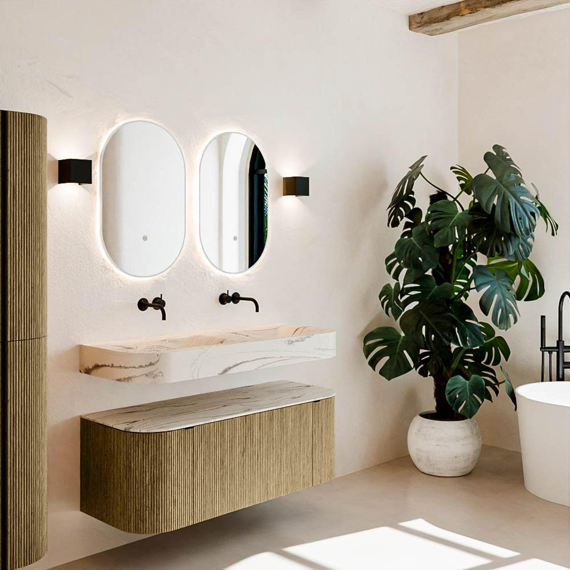 Natuurlijke materialen in warme tinten. De verticale ribbels brengen ritme en textuur in het ontwerp, terwijl het eikenhout zorgt voor een warme, ambachtelijke uitstraling. Kies uit 5 houttinten OAK, WALNUT, DUSK, SHADOW en RUBY zorgvuldig geselecteerde houtkleuren om zowel moderne als klassieke badkamers te verrijken.