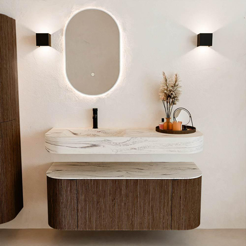 MONDIAZ THOR-DLUX 120cm badmeubel ronding links + rechts kleur Walnut met 1 lade en 2 deuren. Vrijhangende wastafel CLOUD Links 1 kraangat kleur Nata.