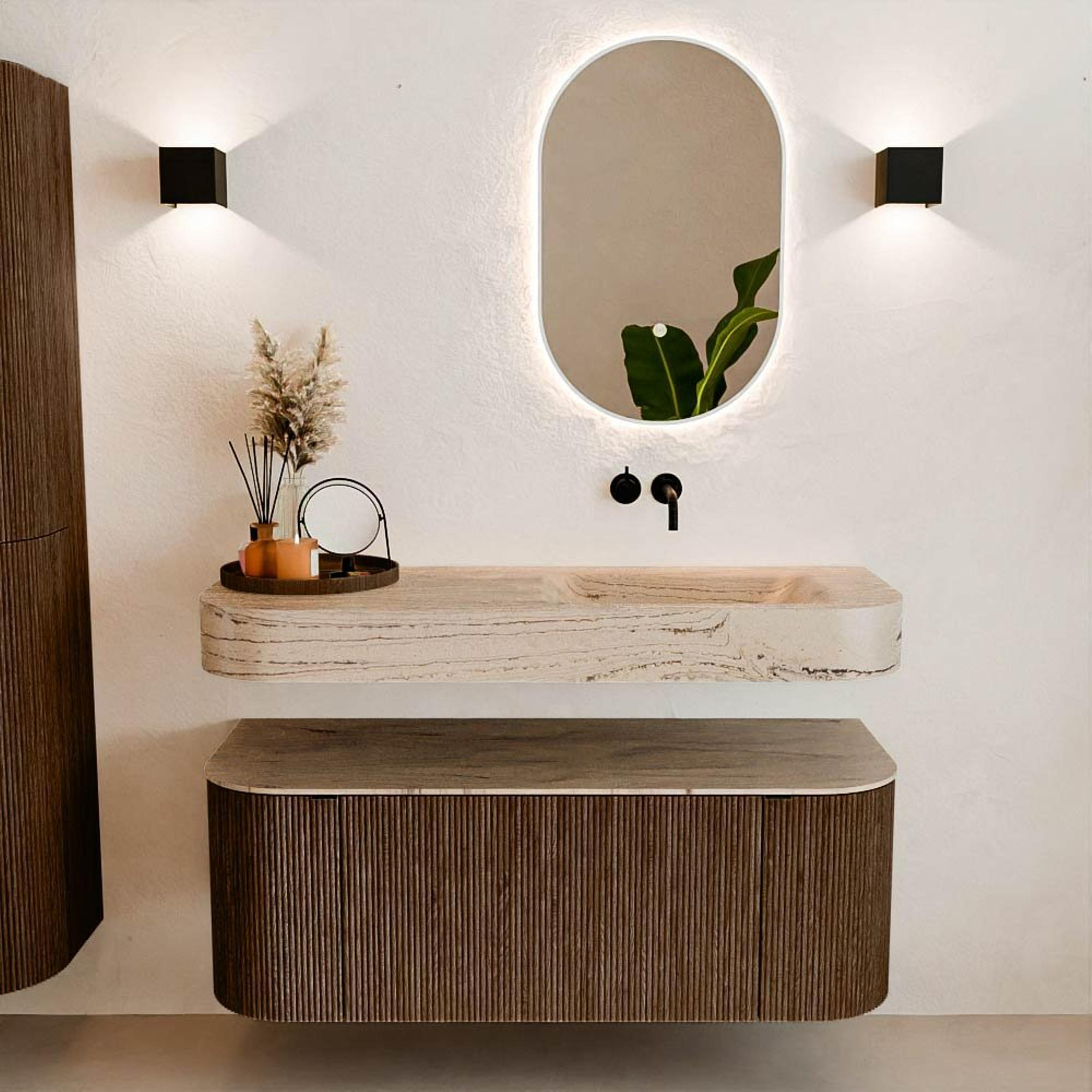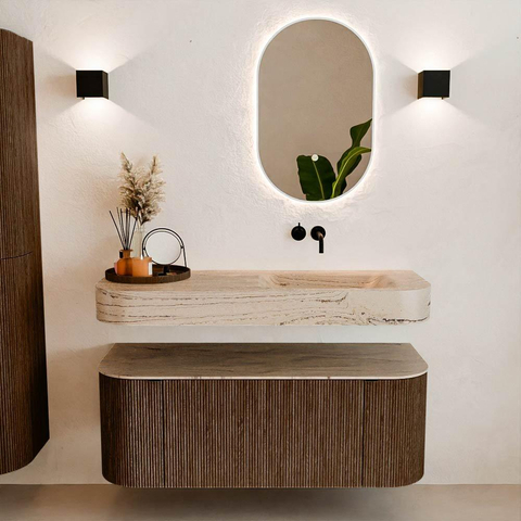 Natuurlijke materialen in warme tinten. De verticale ribbels brengen ritme en textuur in het ontwerp, terwijl het eikenhout zorgt voor een warme, ambachtelijke uitstraling. Kies uit 5 houttinten OAK, WALNUT, DUSK, SHADOW en RUBY zorgvuldig geselecteerde houtkleuren om zowel moderne als klassieke badkamers te verrijken.